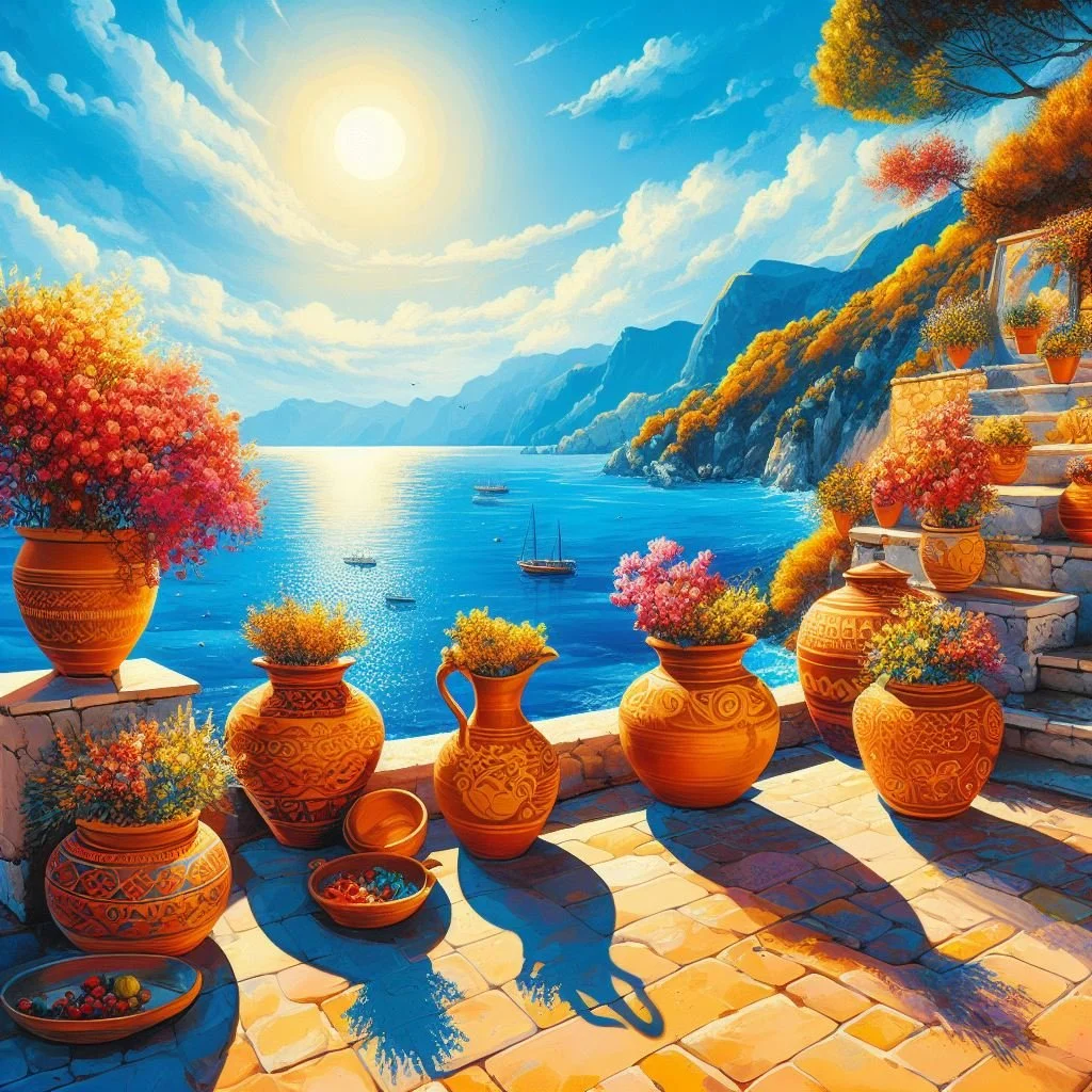 In the Mediterranean, a vivid and vibrant color palette unfolds like a masterpiece. The mesmerizing blues of the sea, reminiscent of endless horizons, mingle harmoniously with the warm and earthy terracottas, as well as the sun-kissed yellows that evoke the radiance of perpetual sunshine. These rich and lively hues collectively lay the foundation for an enchanting coastal retreat, where every shade tells a story of the region's natural beauty and timeless allure. Together, these colors encapsulate the essence of the Mediterranean, offering a visual symphony that beckons you to bask in its captivating and invigorating coastal escape.