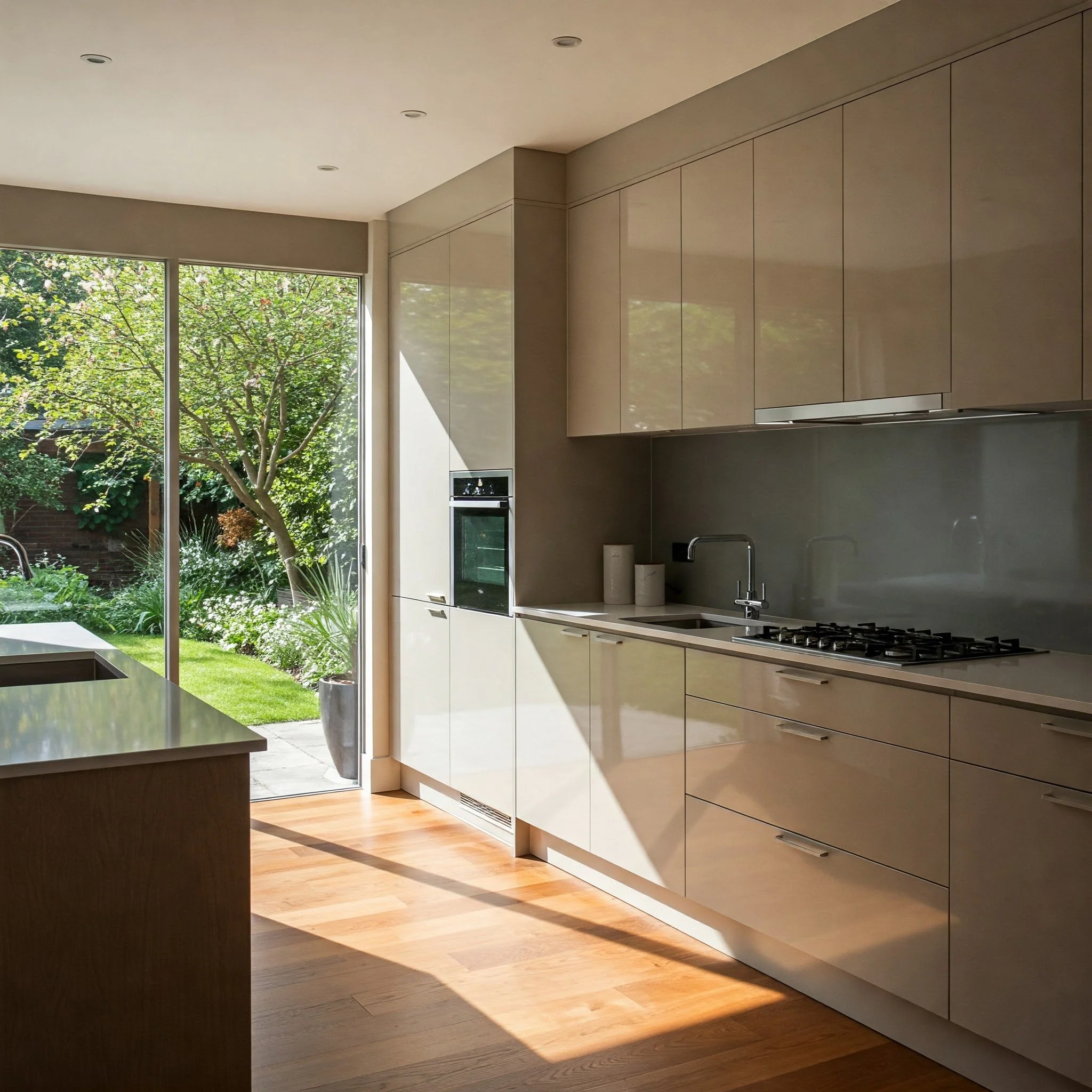 Mid-century modern design thrives on simplicity, and that starts with your cabinet fronts. Think of flat panels free from ornate carvings, giving the space a crisp, uncluttered vibe. The appeal is similar to watching a calm lake at sunrise—there’s beauty in the stillness. Minimalist surfaces make your kitchen appear more spacious and let other elements (like your backsplash or lighting) get the spotlight. If you’re torn between wood and color, you could opt for glossy laminate in neutral shades to maintain that streamlined aesthetic. Don’t be fooled into thinking these sleek fronts are boring, though. Their understated style lends itself well to creative pairings. So feel free to add funky drawer pulls or bold wall art for a personal twist, ensuring your kitchen still feels uniquely yours while channeling that mid-century vibe.