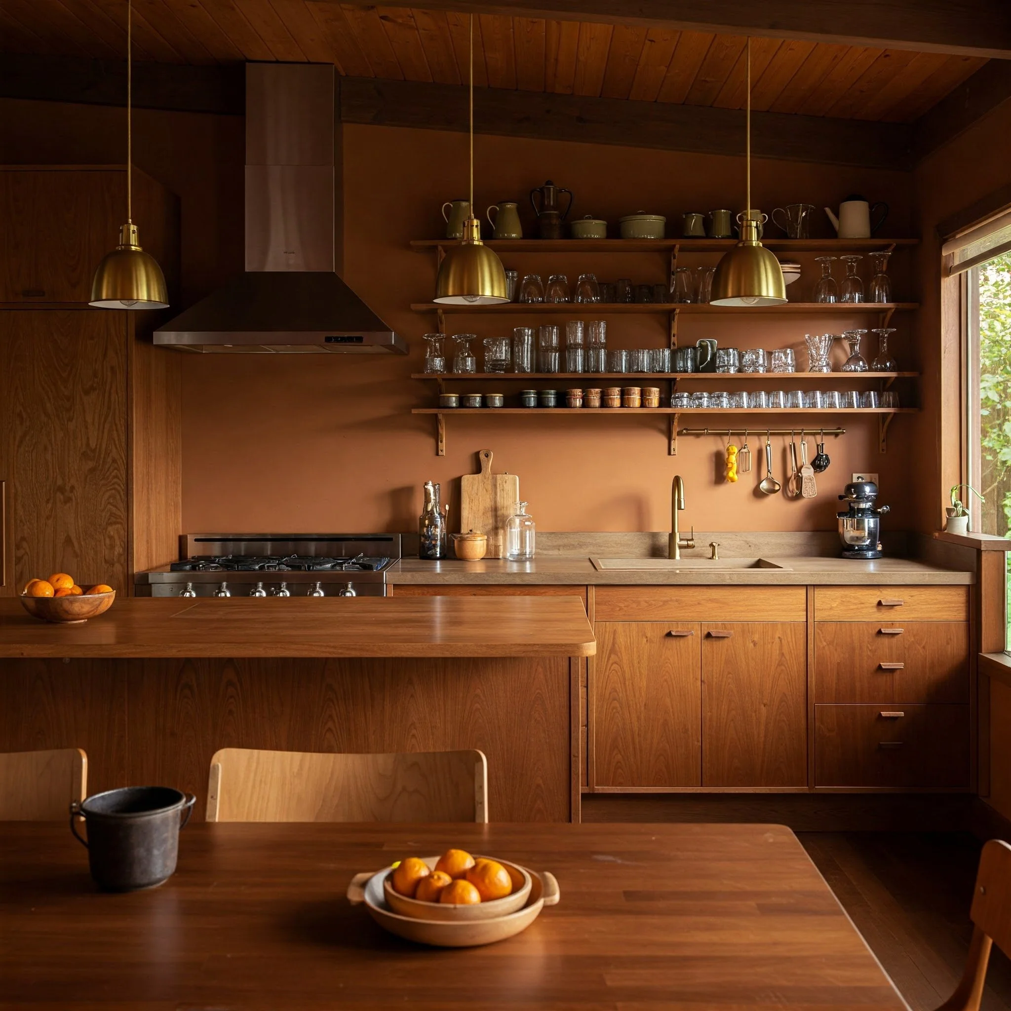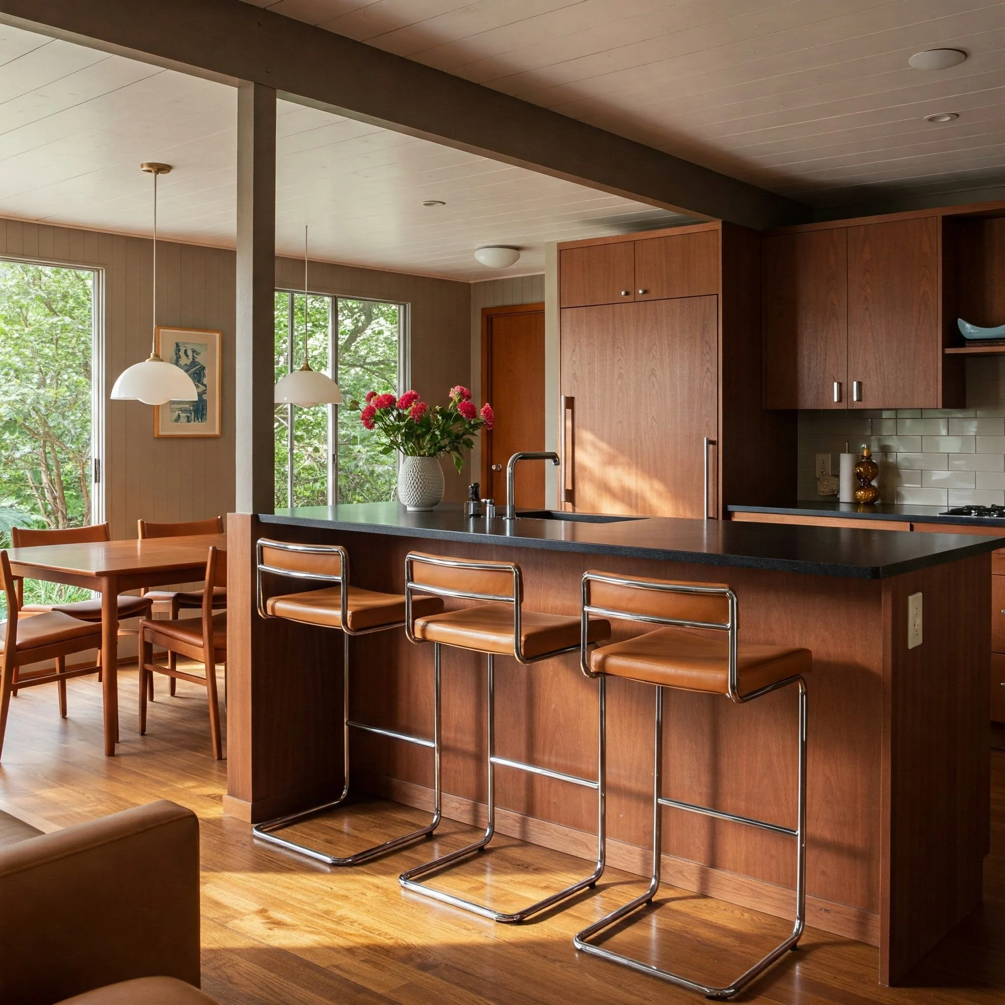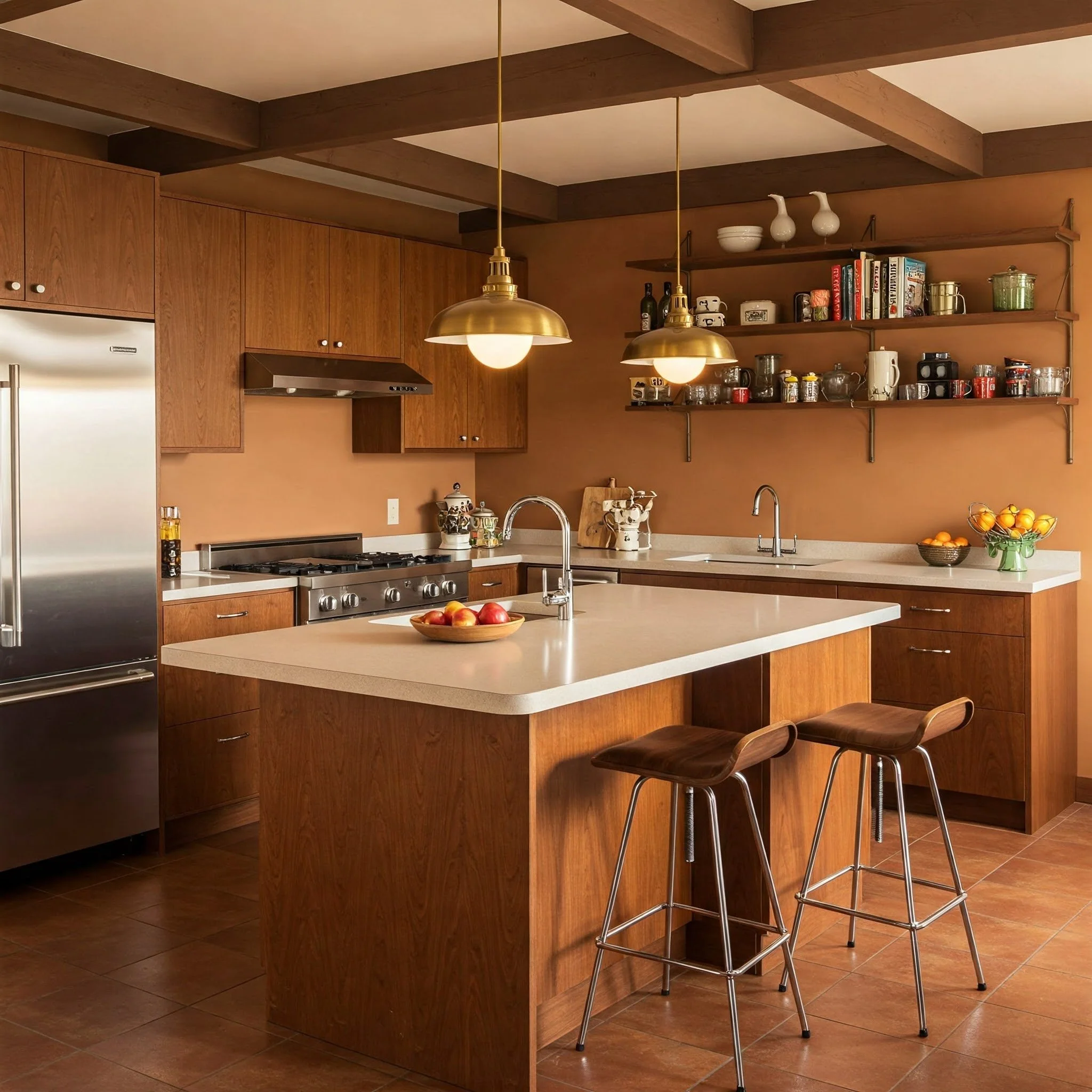 If neutrals dominate your cabinetry and countertops, inject some life with playful mid-century-inspired hues. Picture pops of turquoise, mustard yellow, or burnt orange working like exclamation points in your design sentence. A bright accent wall behind open shelving, perhaps? Or a colorful set of bar stools by the island? These bursts of color can transform the kitchen from merely functional to positively groovy, reminiscent of a 1950s diner yet adapted for modern tastes. Just be mindful not to go overboard. Use color strategically to highlight certain areas or décor pieces, like statement dishware on display or a bold backsplash tile. Think of it like seasoning a dish: a dash of color goes a long way, helping your mid-century modern kitchen recipe taste just right—neither bland nor overwhelming.