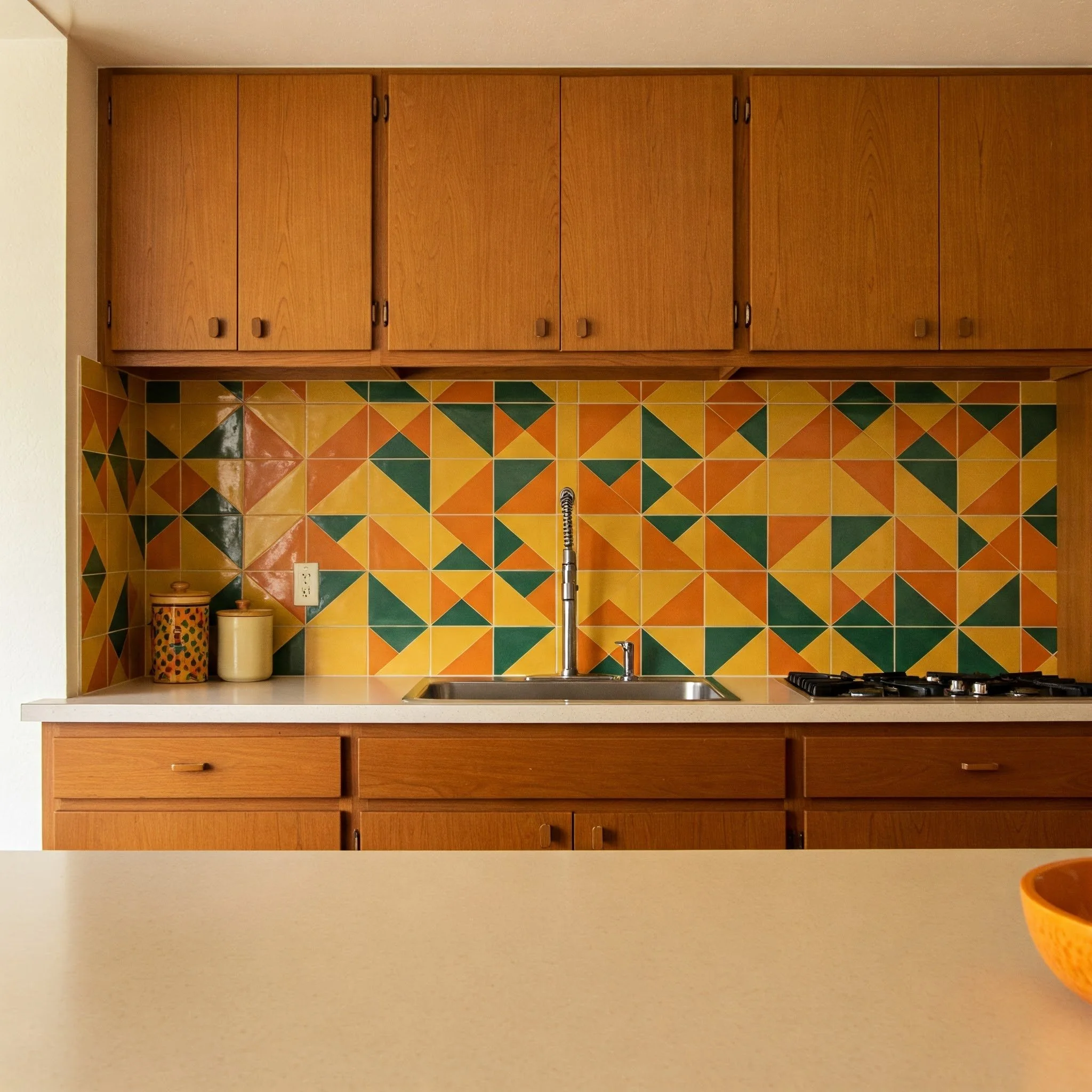 Geometric patterns add a dash of retro fun to any mid-century modern kitchen, and the backsplash is the perfect canvas for these shapes. Whether it’s hexagonal tiles, chevron layouts, or even starburst motifs, these designs conjure a playful, atomic-era feel. Think of them as the energetic heartbeat of your kitchen, pumping life into neutral-toned cabinets. If you prefer a subdued look, consider monochromatic patterns in grays or whites, so the shapes speak for themselves without shouting. Alternatively, mix in a bold color or two—like muted teal or mustard—to lean fully into mid-century charm. This geometric flair can also work wonders in small kitchens, adding visual depth without crowding the space. Remember, the goal is to keep it timeless, so opt for patterns that blend whimsy with enduring style, ensuring you won’t tire of them anytime soon.