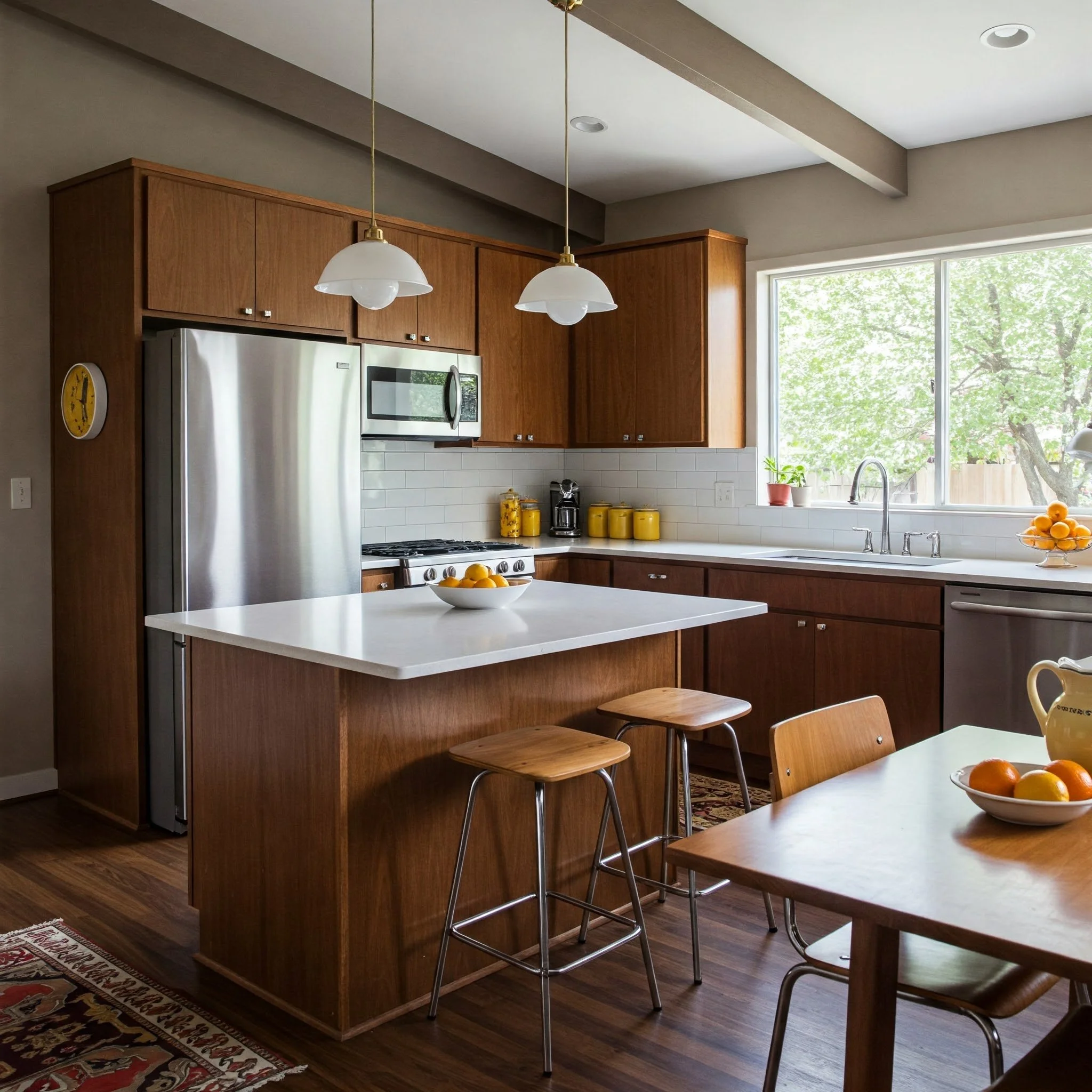 Mid-century modern doesn’t mean you have to go all business, all the time. Add a dose of whimsy with accent décor that channels the era’s lively spirit. Think starburst clocks, abstract artwork, or even ceramic figurines reminiscent of classic 1950s designs. If your color scheme is mostly neutral, small touches like bright yellow canisters or vintage glassware can energize the entire space. It’s kind of like dropping hints of personality throughout the kitchen, giving visitors a glimpse of your style sense. You could also mix in houseplants for a natural pop of green—snake plants and succulents often match the era’s love for organic shapes. The key is restraint: a few well-chosen décor items can make the room feel curated rather than cluttered, preserving that timeless mid-century aura.