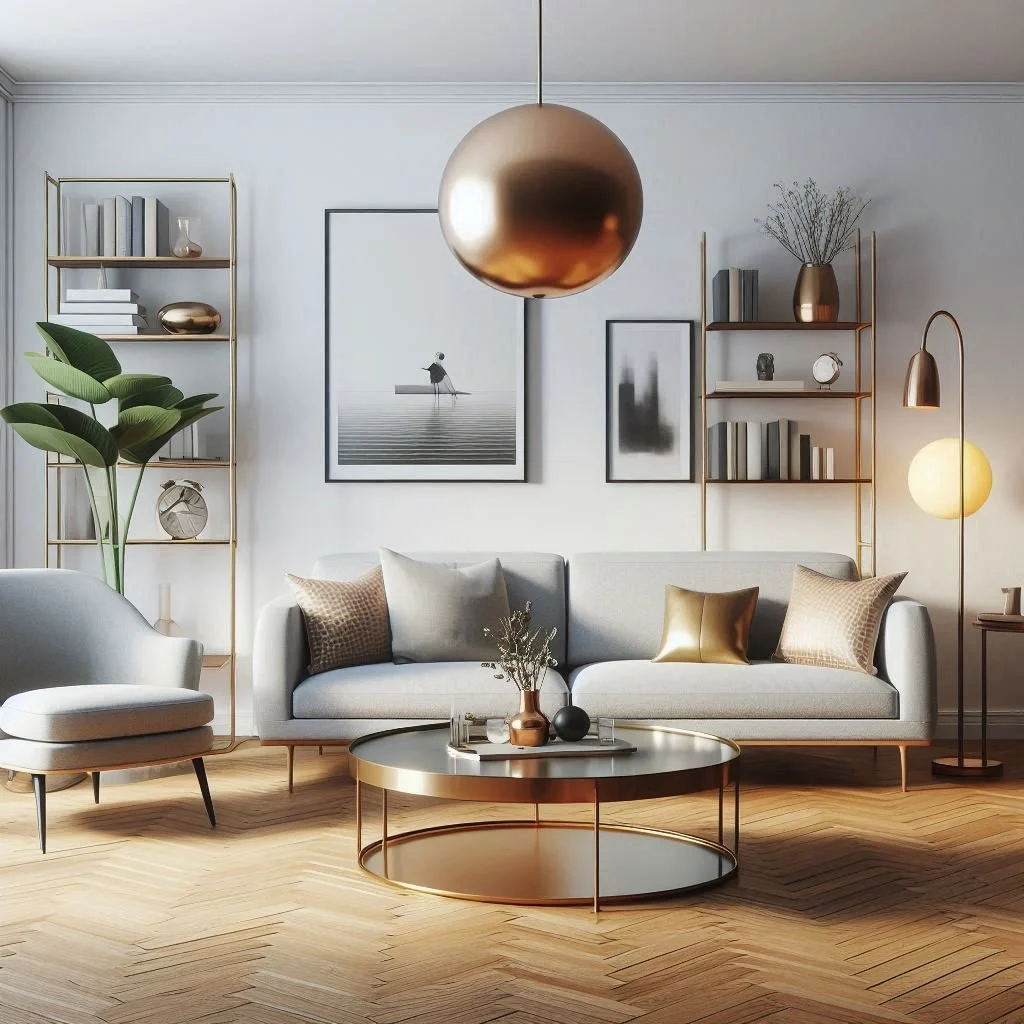 Introduce a touch of glamour to your mid-century modern living room with metallic accents that elevate the decor. Opt for brass, gold, or copper finishes in light fixtures, decorative vases, or table legs to infuse the space with subtle sophistication. These metallic details catch the light, adding warmth and dimension without overwhelming the clean lines and minimalist aesthetic typical of mid-century design. A brass floor lamp or gold-framed mirror can act as understated focal points, while copper accents on side tables or accessories provide a modern, polished look. Incorporating metallics in small doses ensures a balanced design that feels elegant yet approachable. These accents work harmoniously with wood elements and neutral palettes, creating a cohesive space that exudes style. With their subtle shimmer, metallic details enhance the room’s character, adding just the right amount of sophistication to complement your mid-century modern decor.