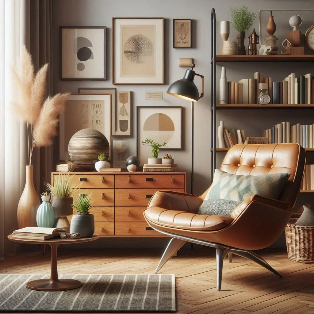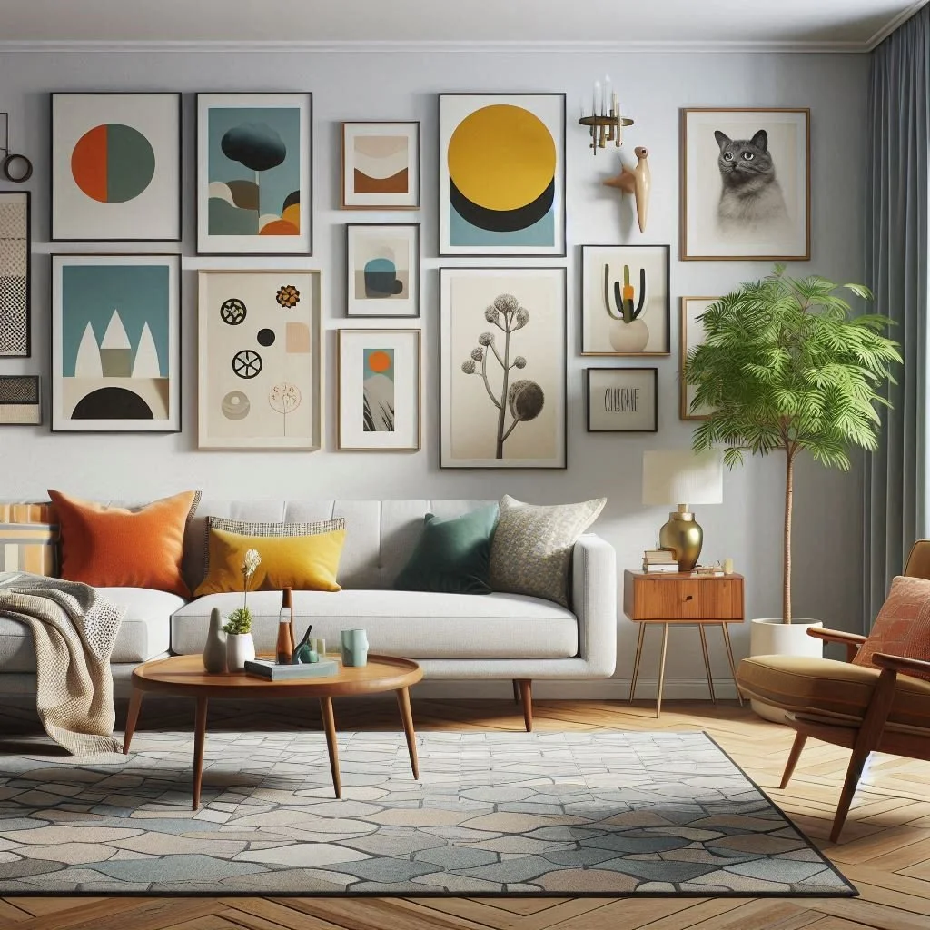 Gallery walls offer a creative way to personalize your space, adding character and charm. For a mid-century modern vibe, choose art prints inspired by the era, abstract designs, or vintage posters that reflect the style’s bold, artistic spirit. Mix frame styles and sizes to create an eclectic arrangement that feels curated yet cohesive. Combining sleek metal frames with classic wood finishes adds variety, while arranging pieces of different shapes ensures visual interest. A thoughtfully designed gallery wall not only showcases your personality but also serves as a dynamic focal point, elevating the room’s decor. Place it above a sofa, sideboard, or along a hallway to enhance the space with both art and nostalgia. With the right balance of mid-century elements, your gallery wall will tie the room together, making the space feel warm, stylish, and uniquely your own.
