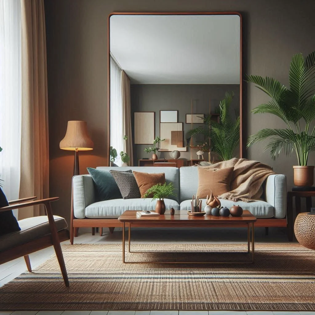 Mirrors serve both functional and decorative purposes, making them a versatile addition to any living room. Incorporate large, round mirrors or vintage sunburst designs to reflect light and create the illusion of a larger space. These mirrors not only enhance the room’s brightness but also introduce a stylish focal point that complements mid-century modern decor. Position them strategically to bounce natural and artificial light around the space, brightening dark corners and making the room feel more open. Mirrors can also be used to highlight key design elements, such as a statement fireplace, artwork, or a well-curated gallery wall. A round mirror above a sideboard or a sunburst mirror over the sofa adds character while maintaining the room’s sleek, cohesive aesthetic. With the right placement, mirrors enhance both form and function, elevating the overall design while making your space feel lighter and more inviting.