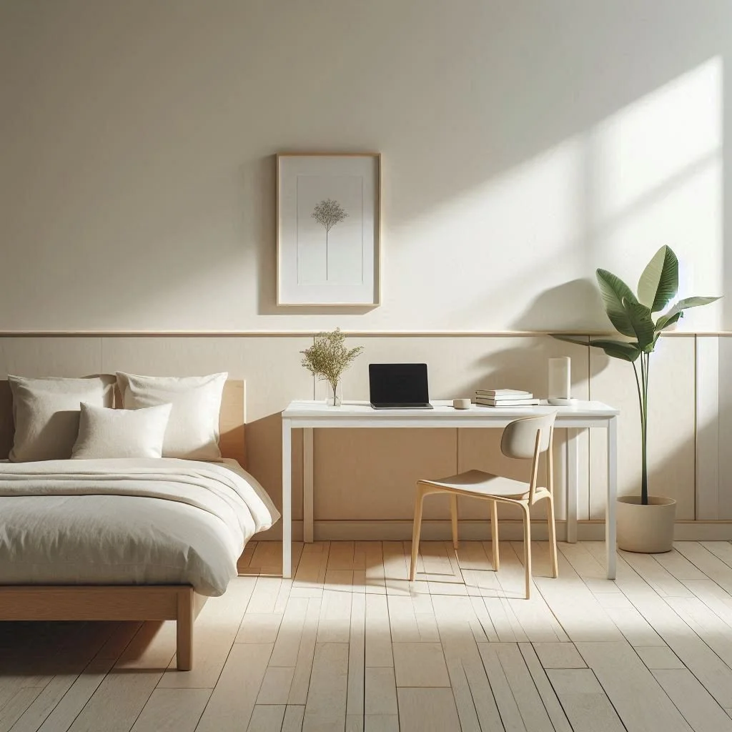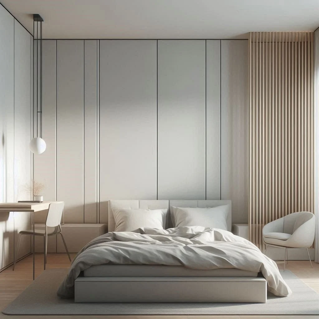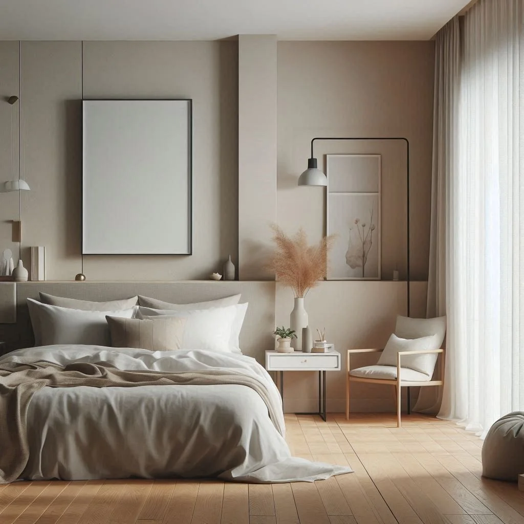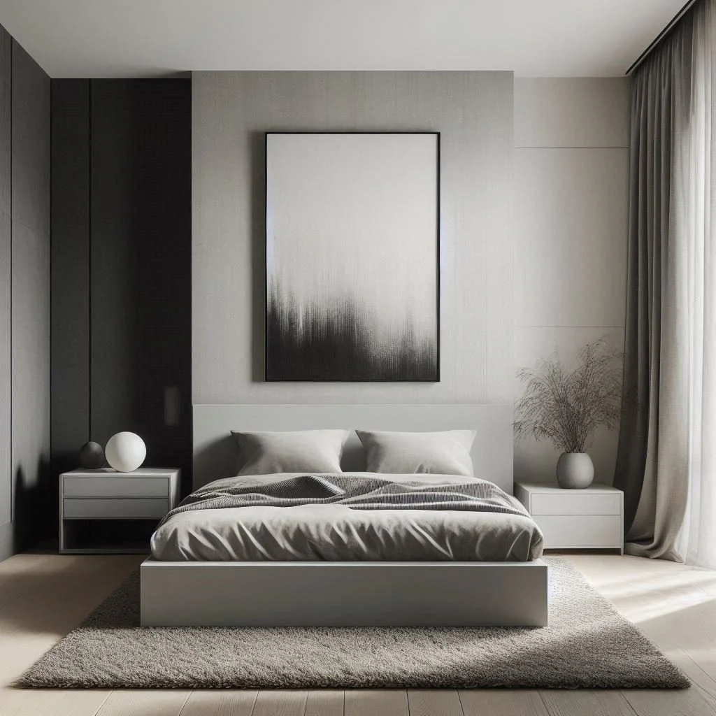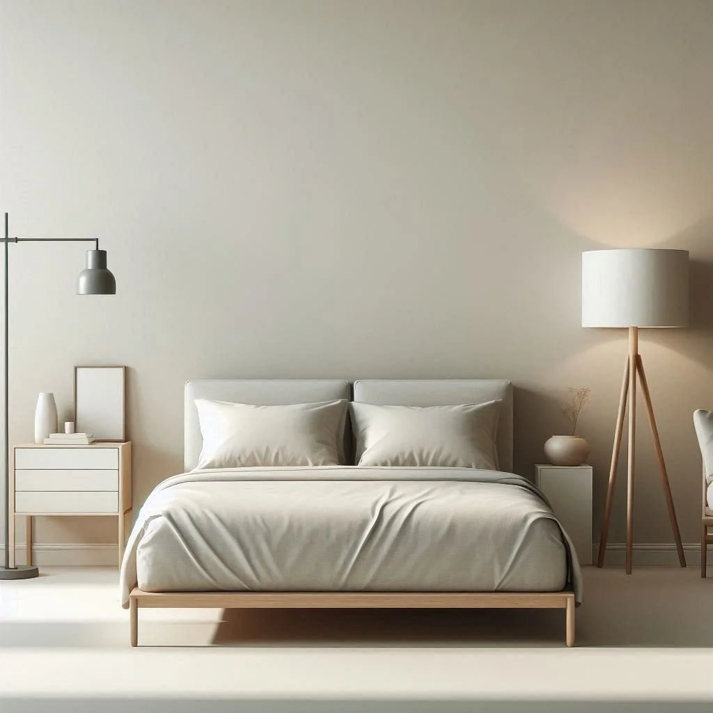 Begin by crafting a serene atmosphere in your minimalist bedroom with a neutral color scheme featuring soft and soothing tones like whites, creams, and light grays. These understated hues establish a tranquil backdrop that fosters a sense of spaciousness and calm conducive to relaxation and restful sleep. Opt for walls painted in crisp white or subtle gray, complemented by accents of warm beige or cool taupe to infuse the space with depth and warmth. By embracing this palette, you create a sanctuary where simplicity meets serenity, inviting you to unwind and rejuvenate amidst a harmonious and tranquil ambiance.