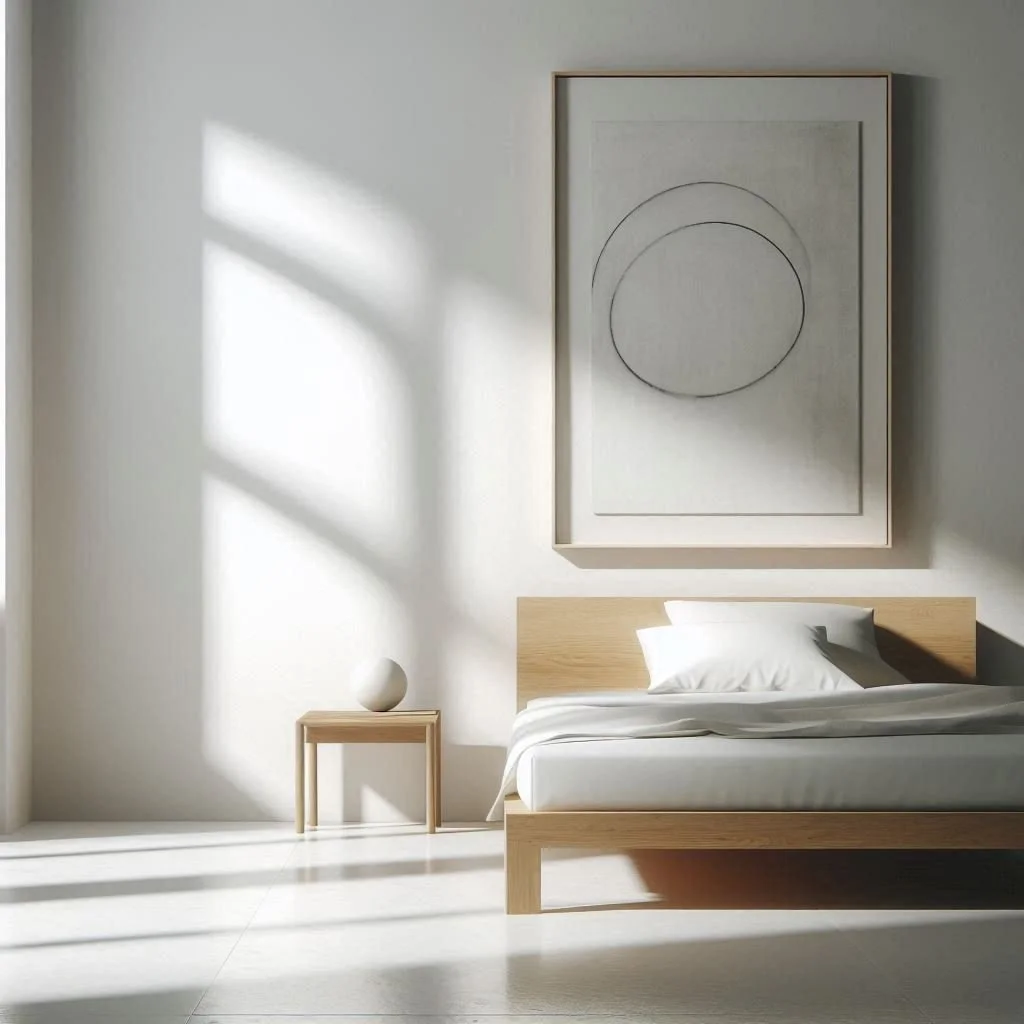 Display minimalist artwork or photography with clean lines and simple compositions to enhance the tranquility of your minimalist bedroom sanctuary. Choose pieces that resonate with your personal aesthetic and evoke a sense of calm and serenity, such as abstract paintings, black-and-white photography, or minimalist sculptures. Keep the arrangement simple and uncluttered, allowing each piece to stand out and make a statement without overwhelming the space. Position artwork strategically above the bed, on empty walls, or atop dressers and shelves to create focal points and draw the eye inward, fostering a sense of introspection and contemplation in your minimalist bedroom oasis.