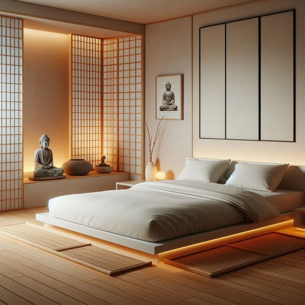 Incorporate elements of Zen decor such as meditation cushions, incense burners, and Japanese-inspired accents to promote relaxation and mindfulness in your minimalist bedroom sanctuary. Choose decor items that evoke a sense of peace, harmony, and balance, such as bamboo blinds, shoji screens, or rock gardens. Create a designated meditation space with a comfortable floor cushion or zabuton and a low table or altar for candles, incense, or sacred objects. Introduce calming elements such as running water, wind chimes, or soothing music to create a serene and tranquil atmosphere that encourages relaxation and stress relief in your minimalist bedroom oasis.