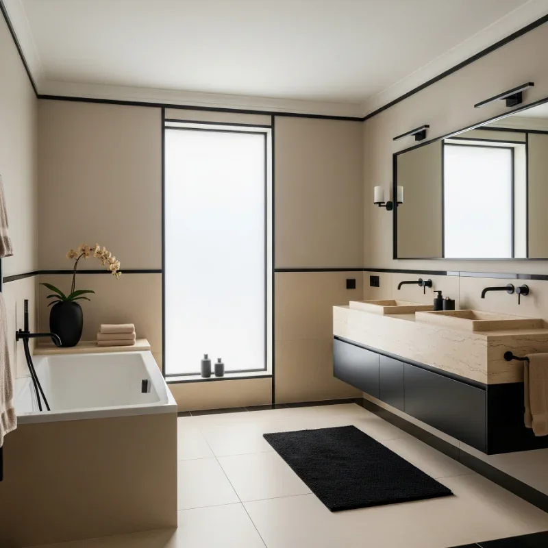 Create striking modern elegance by pairing warm beige with dramatic black accents! This high-contrast combination brings instant sophistication to any bathroom size. Use beige as your dominant color through tiles, walls, or vanity, then punctuate with black fixtures, frames, and hardware. Matte black faucets against beige marble countertops look especially luxe. The warmth of beige softens black's potential harshness while black prevents beige from feeling washed out. Consider black window frames, shower doors, or accent tiles for architectural interest. This pairing works beautifully with both warm and cool beige tones. Add white elements to keep the contrast crisp and prevent heaviness. Your bathroom achieves that coveted high-end boutique hotel aesthetic that feels both welcoming and dramatically sophisticated!