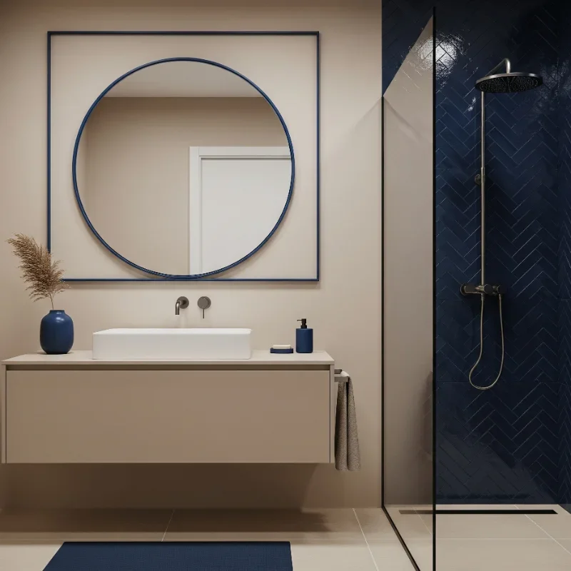Elevate your beige bathroom with sophisticated navy accents that bring depth without overwhelming! This unexpected combination feels fresh yet timeless. Use beige as your foundation through tiles and fixtures, then add navy through vanity cabinets, window treatments, or accent walls. The contrast creates visual interest while maintaining elegance. Navy towels and accessories against beige backgrounds pop beautifully. Consider navy and beige patterned floor tiles for vintage charm with modern execution. Brass or gold fixtures bridge these colors perfectly. This palette works in any size bathroom but especially shines in powder rooms where drama is welcome. Your bathroom achieves that preppy-meets-modern aesthetic that never goes out of style!