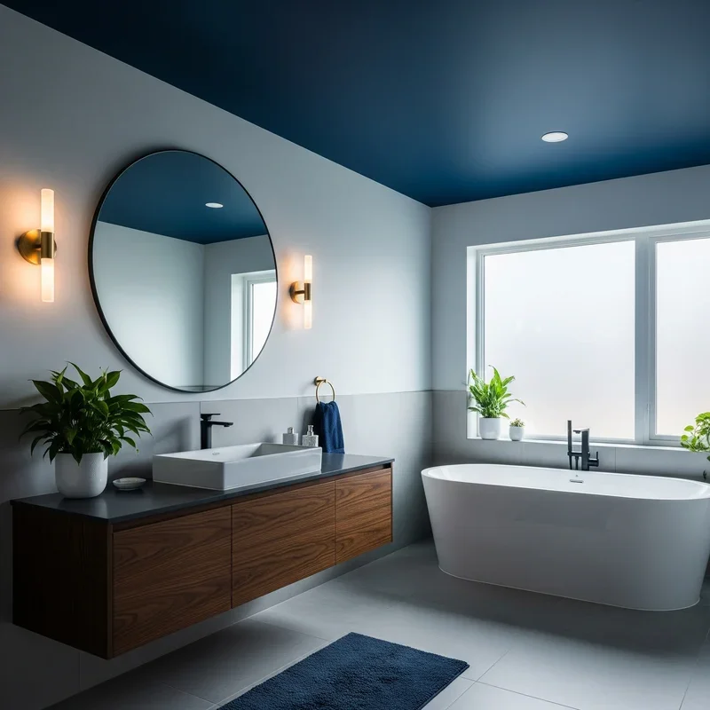 Look up and surprise with a midnight blue ceiling that adds unexpected drama to your bathroom design! This bold choice draws eyes upward, making rooms feel taller while creating an intimate, cocoon-like atmosphere. Dark blue ceilings work especially well in bathrooms with white or light-colored walls, creating beautiful contrast. The deep color makes white crown molding or ceiling fixtures pop like stars against a night sky. This technique works brilliantly in windowless bathrooms where you can control lighting to enhance the moody effect. Pair with warm lighting to prevent the dark ceiling from feeling oppressive or cave-like. Add metallic accents like gold or copper to complement the rich blue overhead. Your ceiling becomes a design statement that proves bathrooms deserve just as much creativity as any other room.
