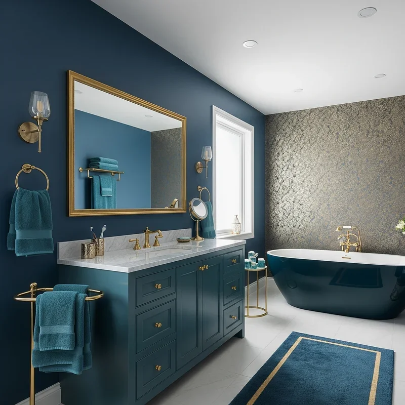 Discover the glamorous pairing of teal and gold that brings Art Deco elegance into the modern era! Teal walls or tiles provide a rich, jewel-toned backdrop that makes gold fixtures and accessories pop dramatically. This combination feels both vintage and thoroughly contemporary, bridging different design eras effortlessly. Use gold faucets, mirror frames, and light fixtures to add warmth to teal's cool tones. The contrast between these colors creates visual tension that keeps the space interesting and dynamic. Add white elements to prevent the combination from feeling too heavy or overwhelming. Consider teal vanity cabinets with gold hardware for a more subtle approach to this color scheme. Your bathroom becomes a sophisticated space that feels curated and intentional rather than trendy.