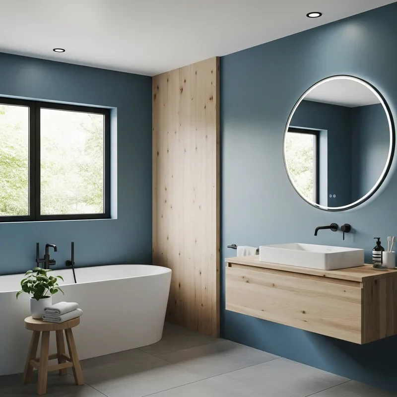 Balance cool blues with warm natural wood for a bathroom that feels both modern and organic! Use blue tiles or paint alongside wooden vanities, shelving, or accent walls for perfect harmony. The combination creates a spa-like atmosphere that feels grounded and calming rather than cold. Light woods like pine or birch keep the space bright while darker woods add sophistication. The natural grain of wood adds texture that complements smooth blue surfaces beautifully. This pairing works whether you prefer minimalist Scandinavian style or more rustic farmhouse aesthetics. Consider waterproofed wood options for areas with high moisture exposure. Your bathroom achieves that perfect balance between contemporary color and timeless natural materials.