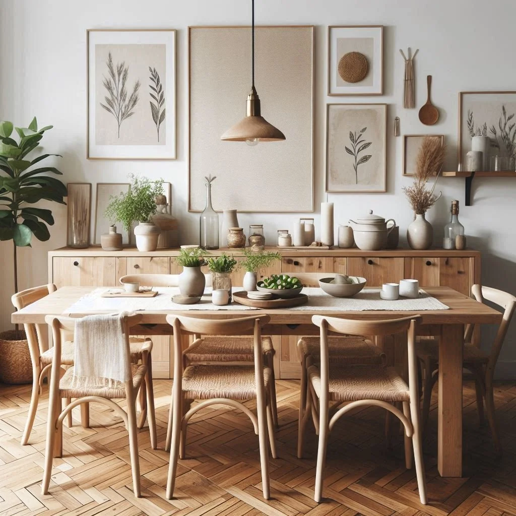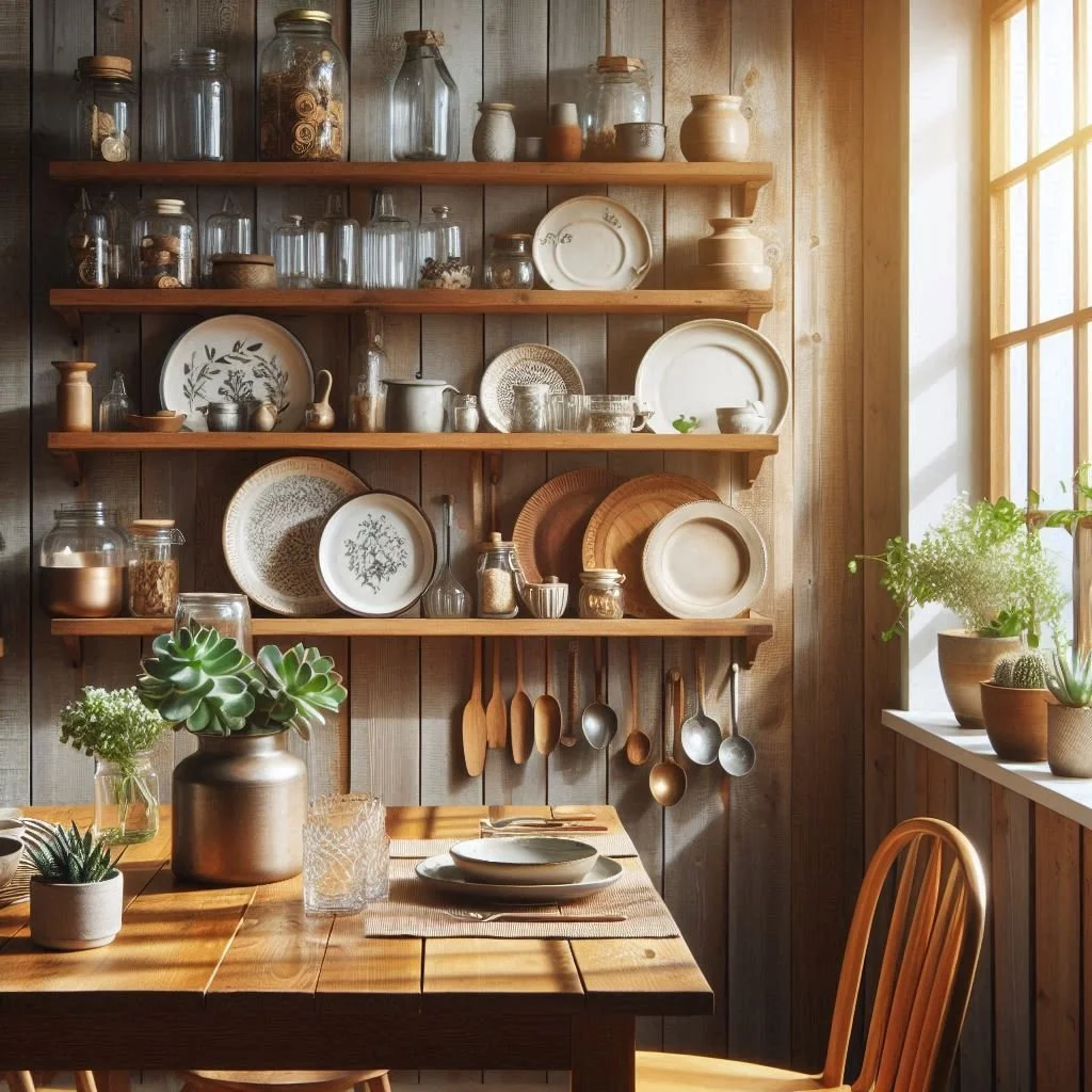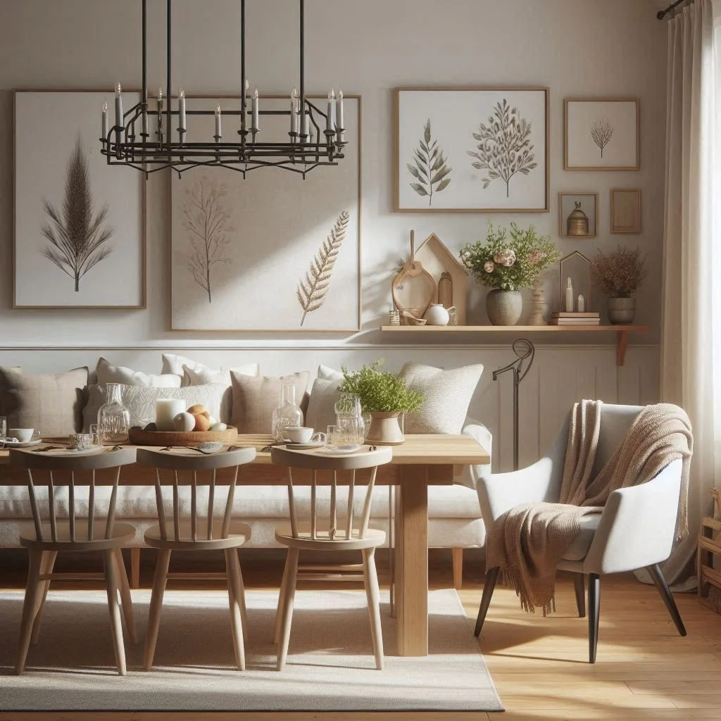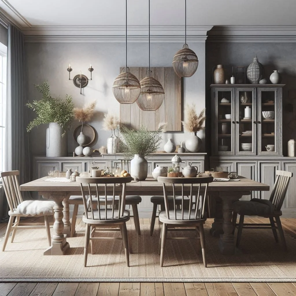 Start with a rustic dining table, add some vintage-inspired seating, and layer in farmhouse accessories like woven baskets, distressed finishes, and cozy textiles.