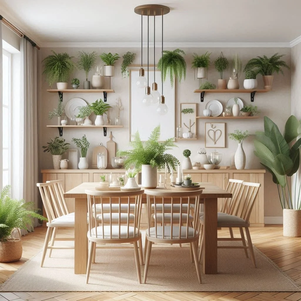 Plants are an easy and effective way to bring life and warmth to your dining room. Whether you choose a large potted plant for a corner or smaller succulents for the table, adding greenery softens the space and creates a more inviting atmosphere. To keep the look cohesive with a modern farmhouse style, opt for simple planters like terracotta pots or galvanized buckets. Fresh flowers in a vase also make a beautiful, seasonal centerpiece that can be updated throughout the year. Incorporating plants and flowers not only enhances the room’s natural charm but also adds a fresh, vibrant touch to your dining space.