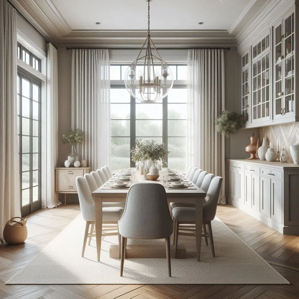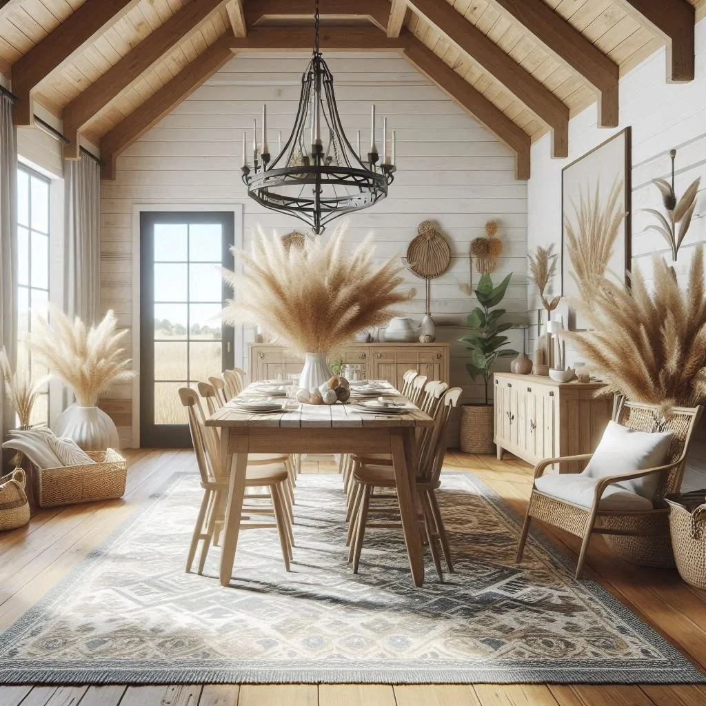 A well-chosen rug can tie your modern farmhouse dining room together, adding warmth and comfort to the space. Opt for rugs with classic patterns like stripes or vintage-inspired motifs that complement the room’s neutral color palette. Natural fiber rugs, such as jute or sisal, are also ideal for bringing texture and a rustic touch to the design. When selecting a rug for under the dining table, ensure it’s large enough to accommodate both the table and chairs, even when the chairs are pulled out. This not only adds a cohesive look but also creates a cozy, inviting atmosphere in your dining space.