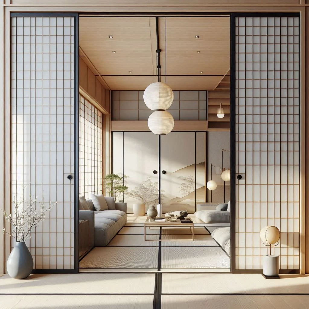 Sliding Shoji doors are a quintessential element of Japanese interiors, offering both functionality and aesthetic appeal. Made from translucent paper set within wooden frames, Shoji doors allow soft light to filter through, creating a serene and diffused glow. These doors provide privacy while maintaining an open, airy feel, making them ideal for separating spaces in a way that doesn’t disrupt the overall flow of a room. Their minimalist design complements various decor styles, adding a touch of traditional elegance. Perfect for living rooms, bedrooms, or dividing open spaces, Shoji doors embody the balance of simplicity and beauty central to Japanese interior design.