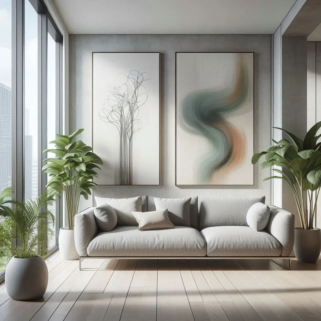 Incorporating art into your modern living room can be beautifully achieved by selecting one large, bold piece as the focal point. An oversized artwork—be it a vibrant abstract painting or a striking black-and-white photograph—commands attention and adds a dramatic flair to your space. Position the artwork above your sofa or fireplace to create a stunning visual impact, allowing it to serve as the room's centerpiece. This approach not only draws the eye but also enhances the overall ambiance without overwhelming the design. To maintain a cohesive look, keep the surrounding decor minimal and understated, allowing the artwork to shine. By doing so, you create a sophisticated environment that showcases your artistic taste while preserving the clean lines and uncluttered aesthetic characteristic of modern design. This elegant balance transforms your living room into a refined space that exudes style and personality.