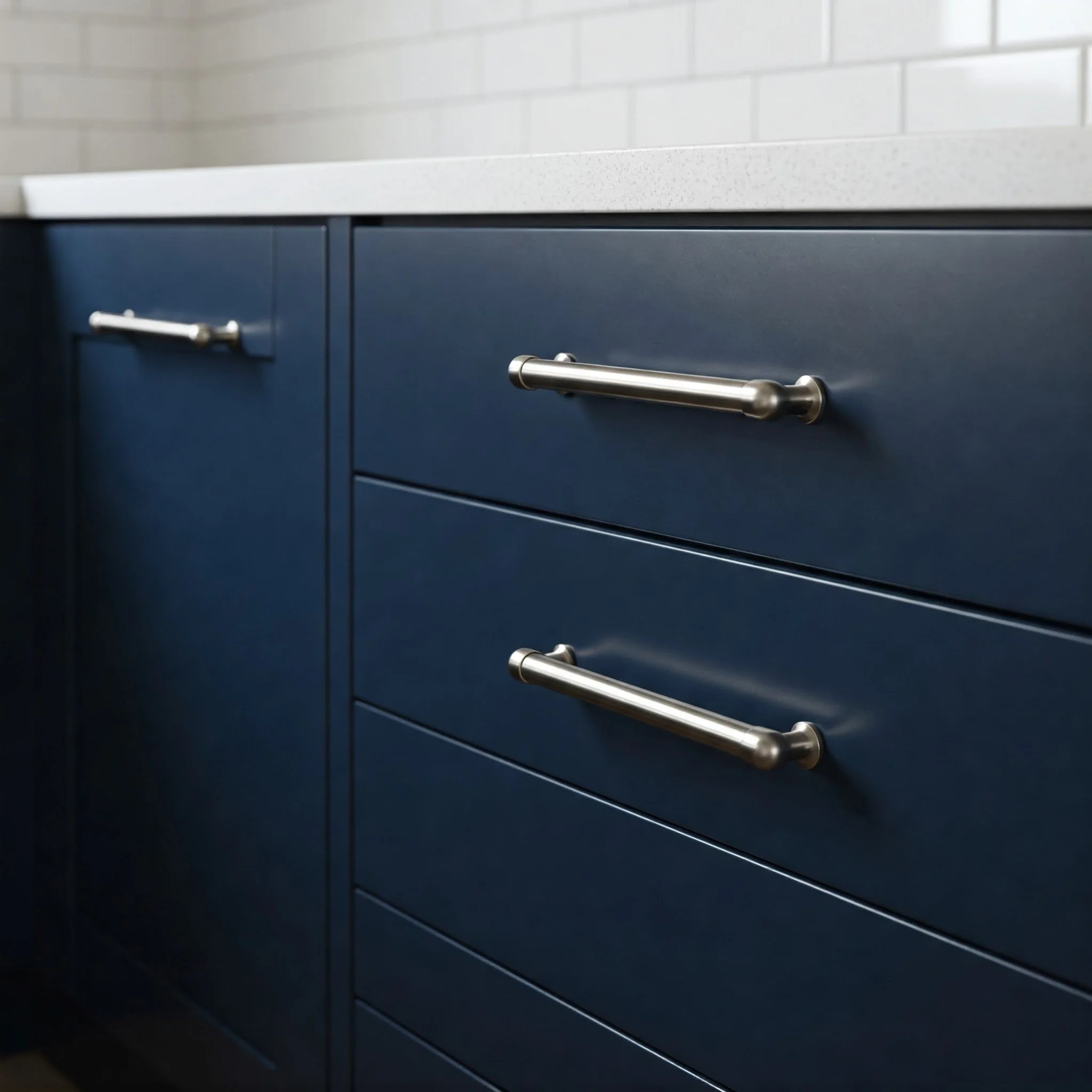 Hardware may seem like a small detail, but it can make or break your navy cabinet design. Imagine your cabinets as a stylish blazer—would you pair it with mismatched, outdated buttons? Definitely not. Contemporary kitchens often lean toward slim, minimalist hardware in materials like brushed steel or matte black, which offset navy’s rich hue without overwhelming it. If you’re going for a more lavish look, think polished brass or satin gold handles that pop like jewelry against a dark dress. The trick is to ensure consistency throughout: keep the style and finish uniform across all doors and drawers. If you want something truly minimal, consider hidden pulls or push-to-open mechanisms, leaving the navy front uninterrupted. In essence, hardware is like the finishing touch that ties your entire kitchen ensemble together, so choose wisely.