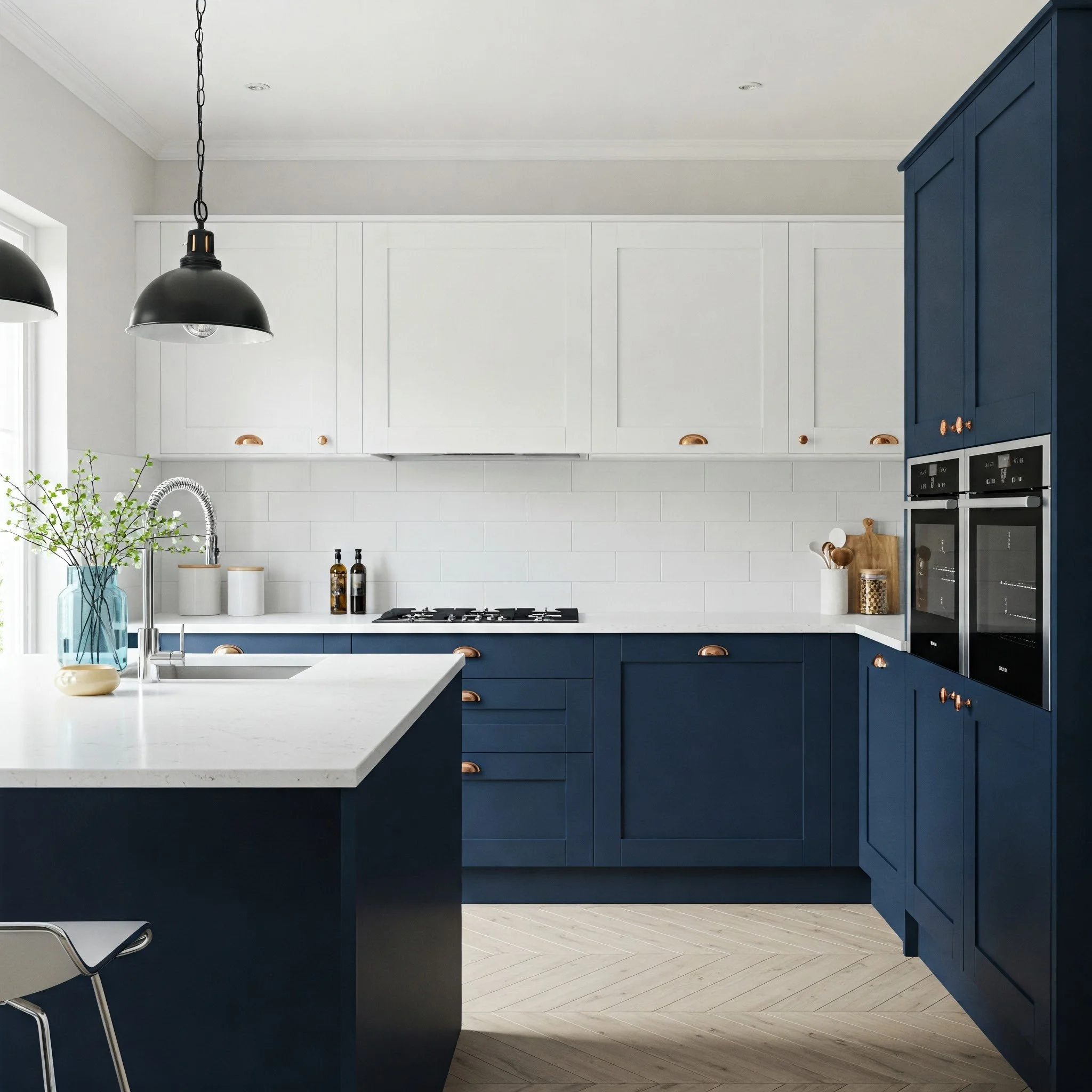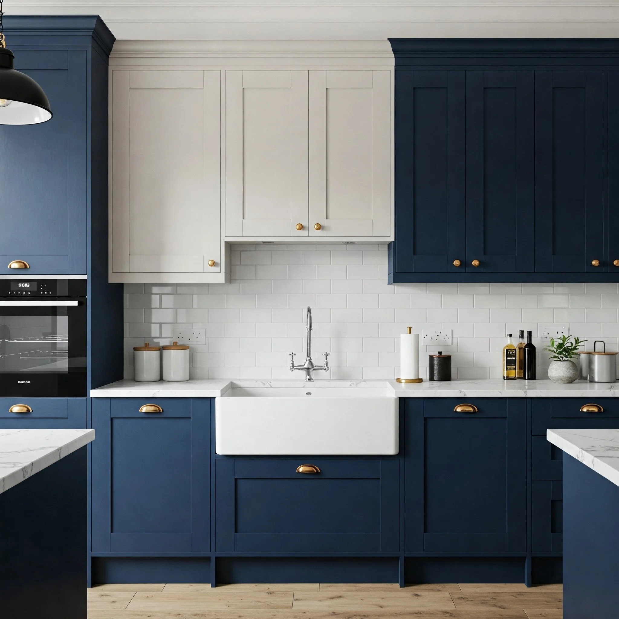 Not sure if you want your entire kitchen draped in navy? Split the difference by using two-tone cabinets—navy on the lower units, and a lighter shade up top. It’s like having two personalities in one space: a bold, confident base that anchors the room, and a breezy, brighter top that keeps it feeling open. White, cream, or even a gentle pastel hue can work wonders above, while your navy anchors below. This not only creates a sense of balance but also draws the eye upward, making the ceiling seem higher. For a cohesive finish, match hardware or keep countertops consistent across both levels. Think of it as layering your outfit: you’ve got a strong foundation (the navy) paired with a complementary layer that adds dimension and flair. The result is a dynamic, modern look that feels fresh and inspired.