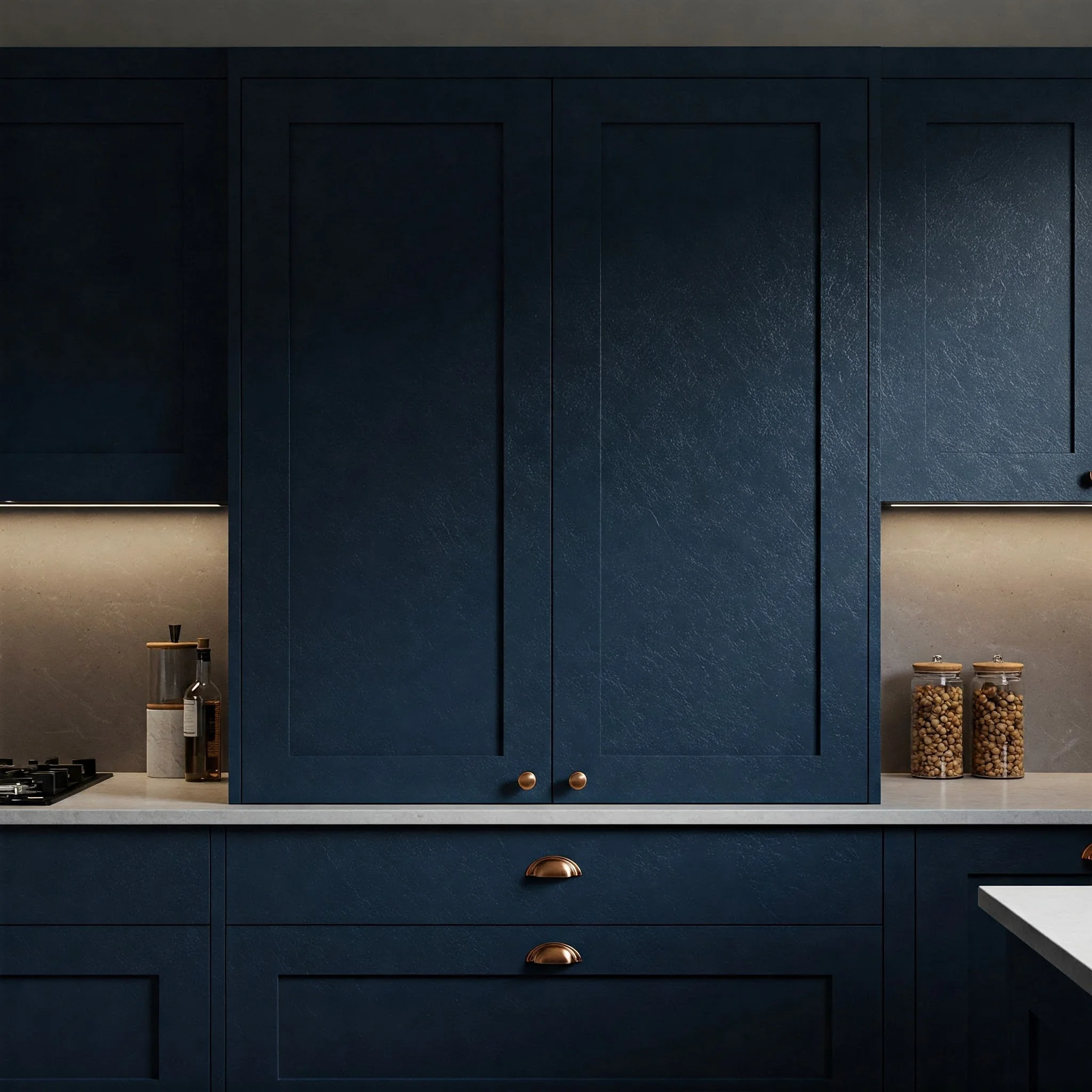 When you think navy blue, don’t limit your imagination to a flat matte or standard gloss. Textured finishes can give your cabinets a fresh twist, adding depth and tactile intrigue to your kitchen. Imagine the subtle ridges of beadboard or the rustic flair of distressed wood in a deep-blue stain, evoking a hint of a weathered seaside cottage. Such textures break up the visual uniformity, providing a layer of complexity that makes people want to reach out and touch. If you prefer a sleek look but still want some dimension, go for a satin finish that catches light in gently shifting ways. Balance the textured cabinets with simpler countertops—quartz, marble, or a subdued granite—so the overall design doesn’t become overwhelming. It’s like crafting a well-tuned orchestra, where each instrument plays a unique part in the grand symphony of your kitchen design.