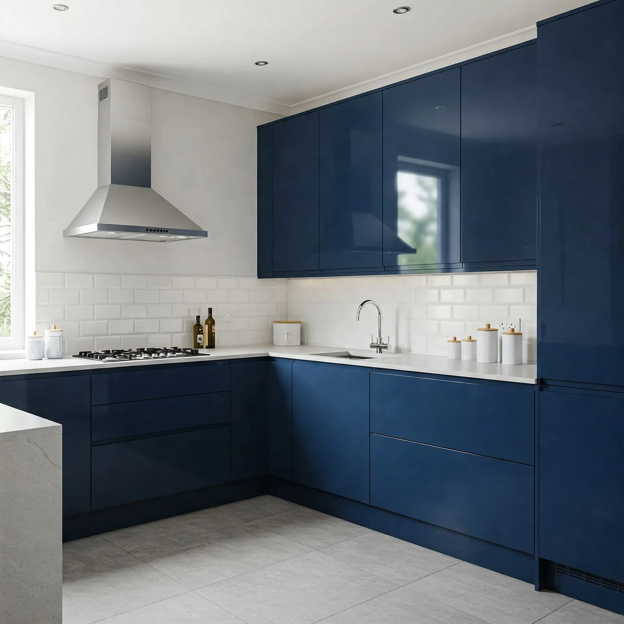 For those who love a bit of drama and aren’t afraid of shiny surfaces, high-gloss navy cabinets can make a memorable impression. The reflective finish bounces light around the room, making the space feel bigger and more dynamic—even when using such a dark hue. It’s like turning your cabinets into polished gemstones that catch the eye from every angle. High-gloss works particularly well in contemporary or ultra-modern layouts, where minimalist lines and bold statements go hand in hand. To keep fingerprints and smudges at bay, opt for durable finishes or advanced lacquers designed for heavy use. Pair these glossy cabinets with sleek metal or acrylic hardware for a futuristic vibe, or balance them with natural elements like a wooden butcher-block countertop. Either way, the shine will make your kitchen glow with style, akin to a sophisticated city skyline at night.