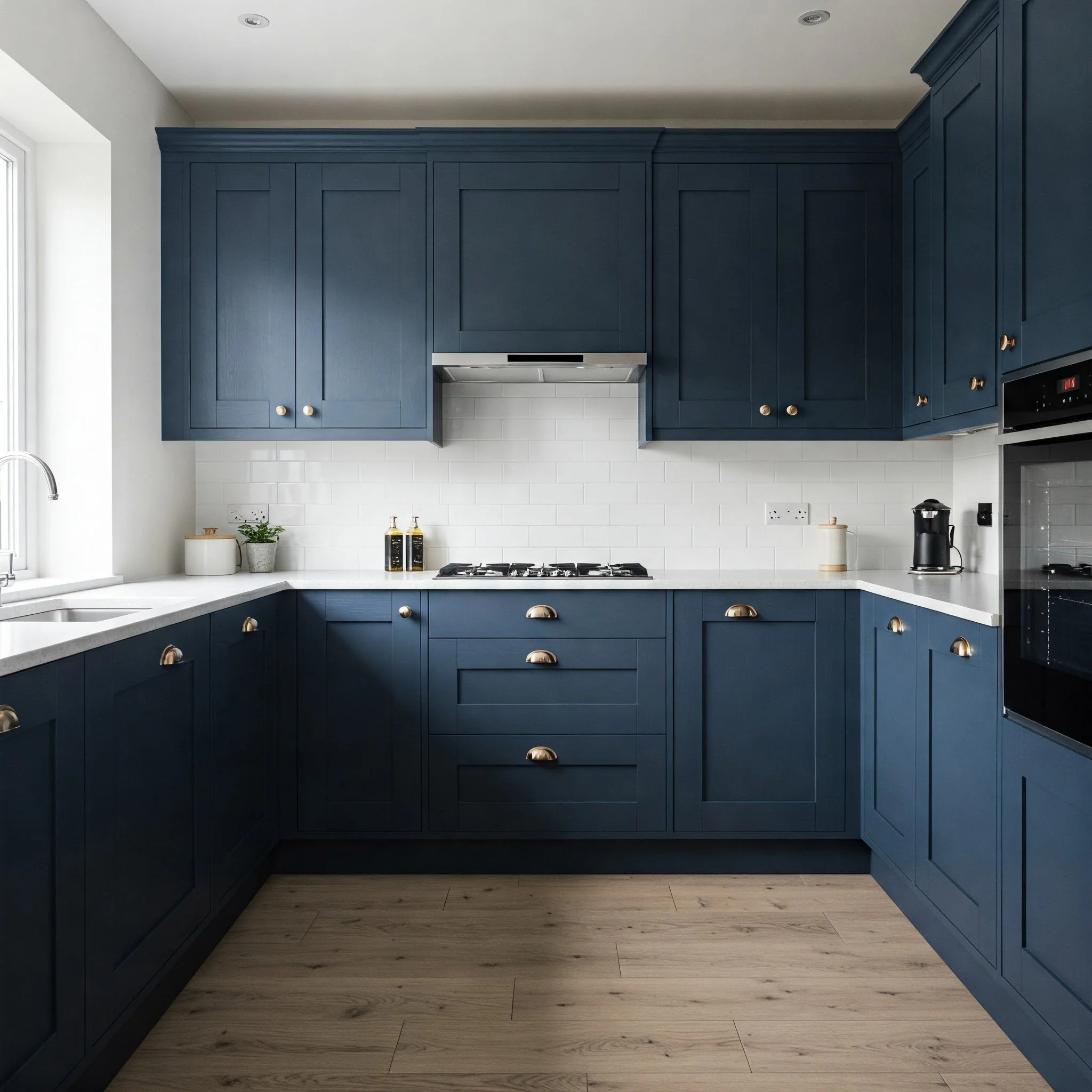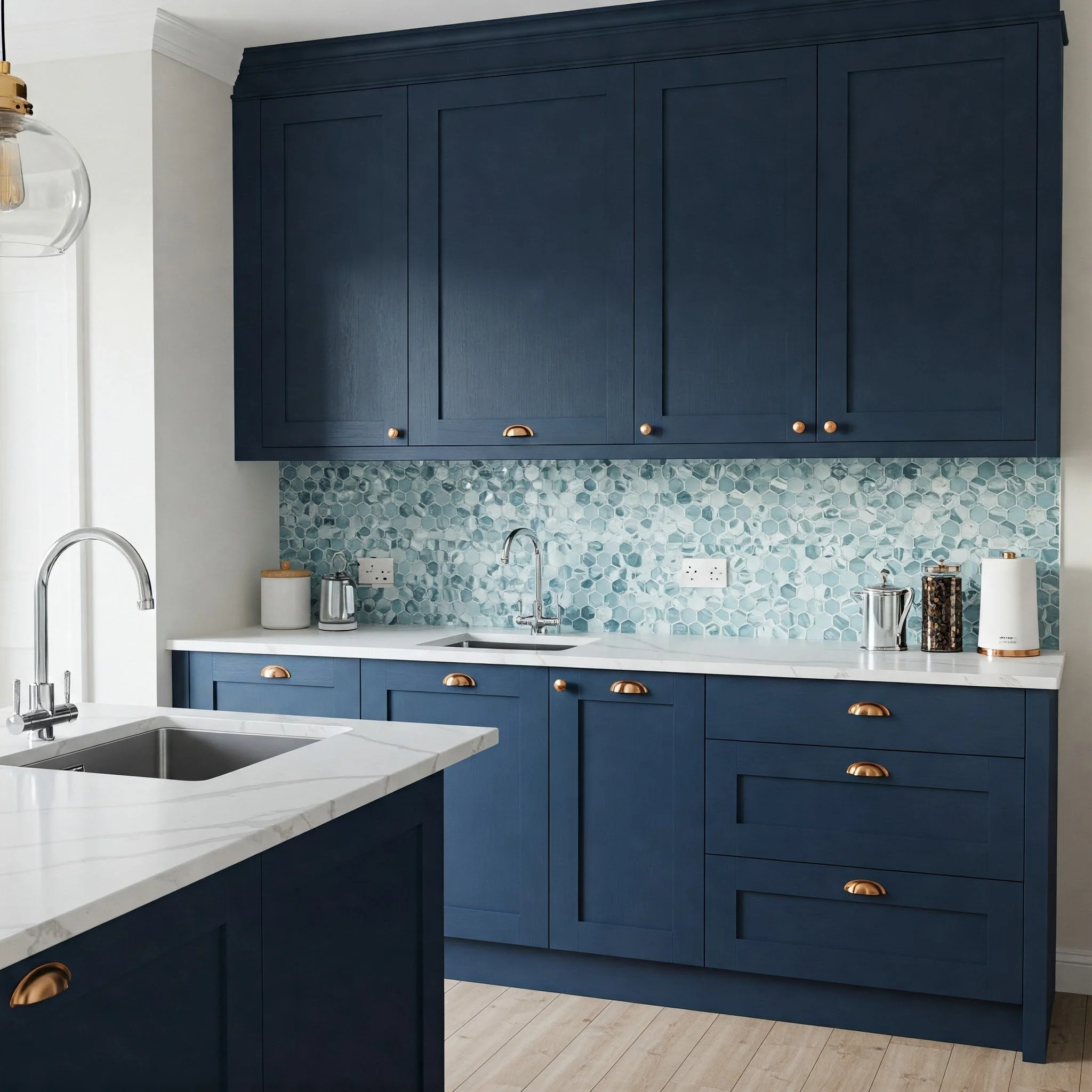 It depends on the room’s natural light and your overall design. Pairing navy with lighter elements, like white walls or countertops, can maintain a spacious look even in smaller kitchens.