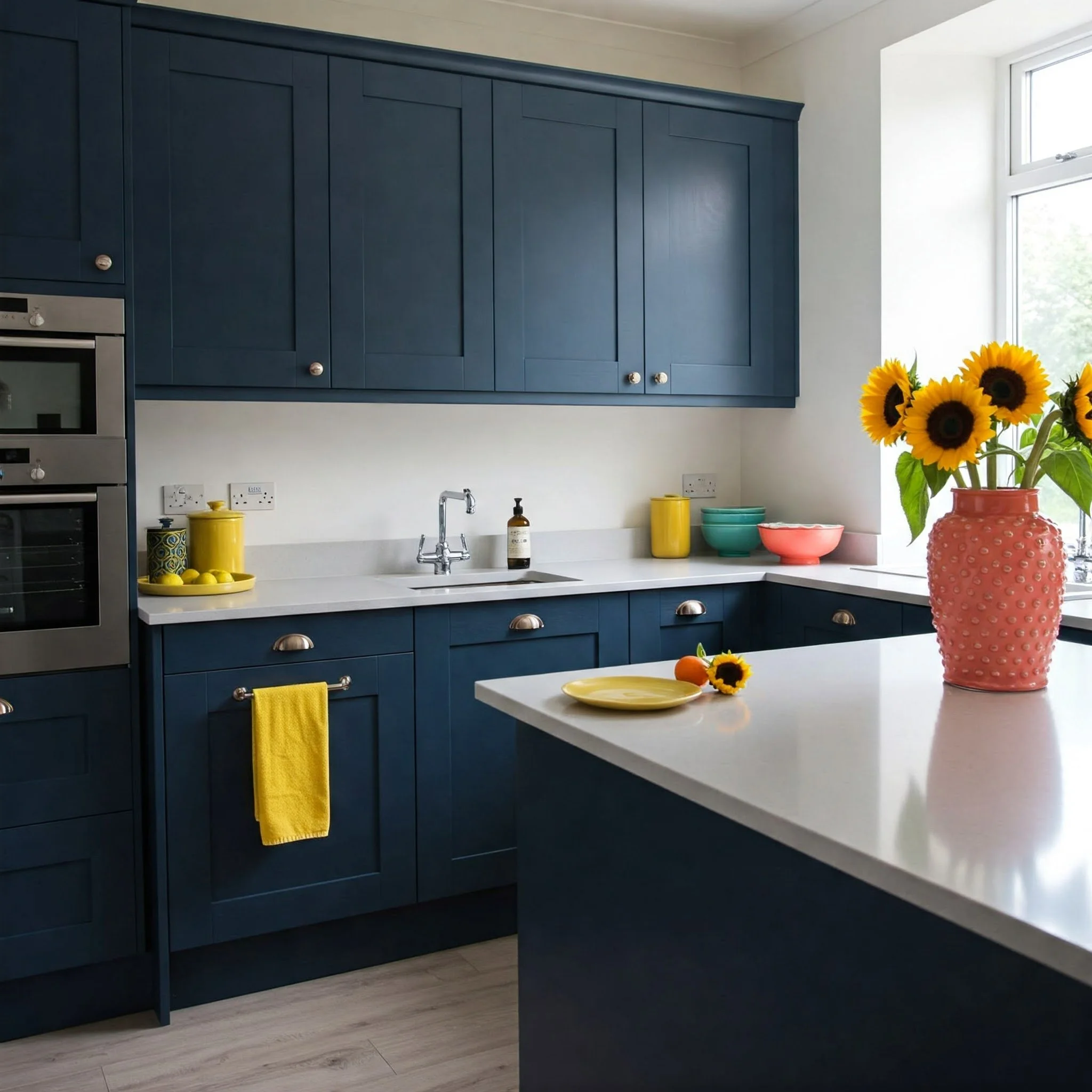 Navy blue offers a strong canvas, but that doesn’t mean you can’t play with additional hues to liven up your space. Accessories—like barstools, rugs, dish towels, or even small appliances—give you the freedom to introduce complementary colors. Imagine a dash of mustard yellow in a throw pillow or artwork against a navy cabinet background. It’s like adding a bright scarf to a classic outfit. Light pastel accents, such as mint green or blush pink, can also soften the boldness of navy, creating a playful, modern atmosphere. Don’t overlook the power of greenery—potted herbs or hanging plants provide a fresh, natural contrast. By mixing colorful accessories, you can refresh your kitchen’s look whenever you please, proving that even the most sophisticated color palettes can have a little fun.