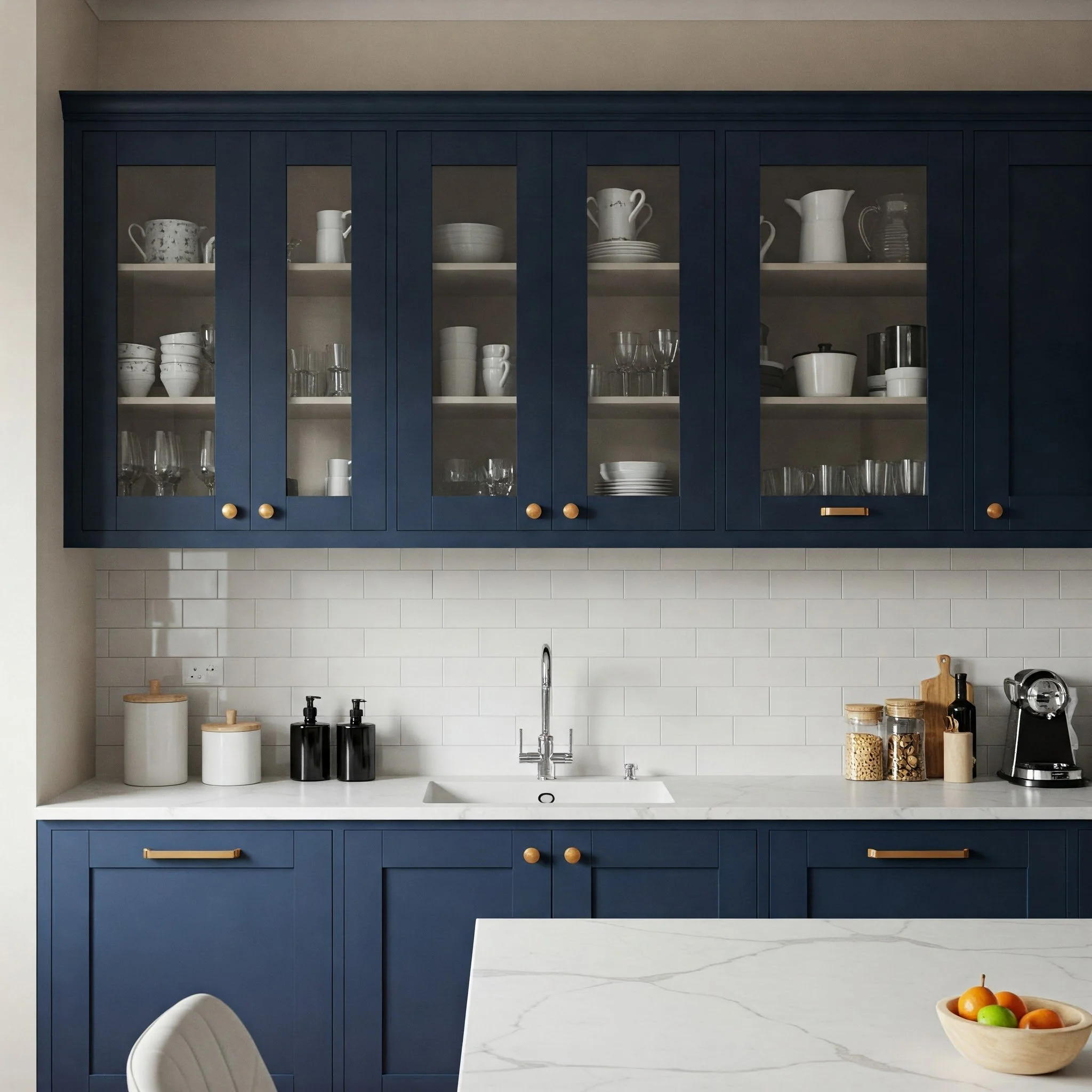 Glass inserts offer an elegant way to break up the solid expanse of navy-blue cabinets. Think of them as little windows into your cabinet world, showcasing your favorite dishware, wine glasses, or decorative pieces. Transparent or frosted glass can both work; transparent glass highlights your collection, while frosted glass adds an element of mystery without revealing clutter. This approach also prevents the room from feeling too boxed in, allowing light to dance through the cabinet interiors. Some homeowners like adding interior lighting in glass-front cabinets, transforming them into miniature display cases that glow softly in the evening. It’s akin to curating a mini art exhibit right in your kitchen. When combined with navy, these glass panels create a refined yet welcoming vibe, perfect for hosting gatherings or simply admiring your everyday essentials.