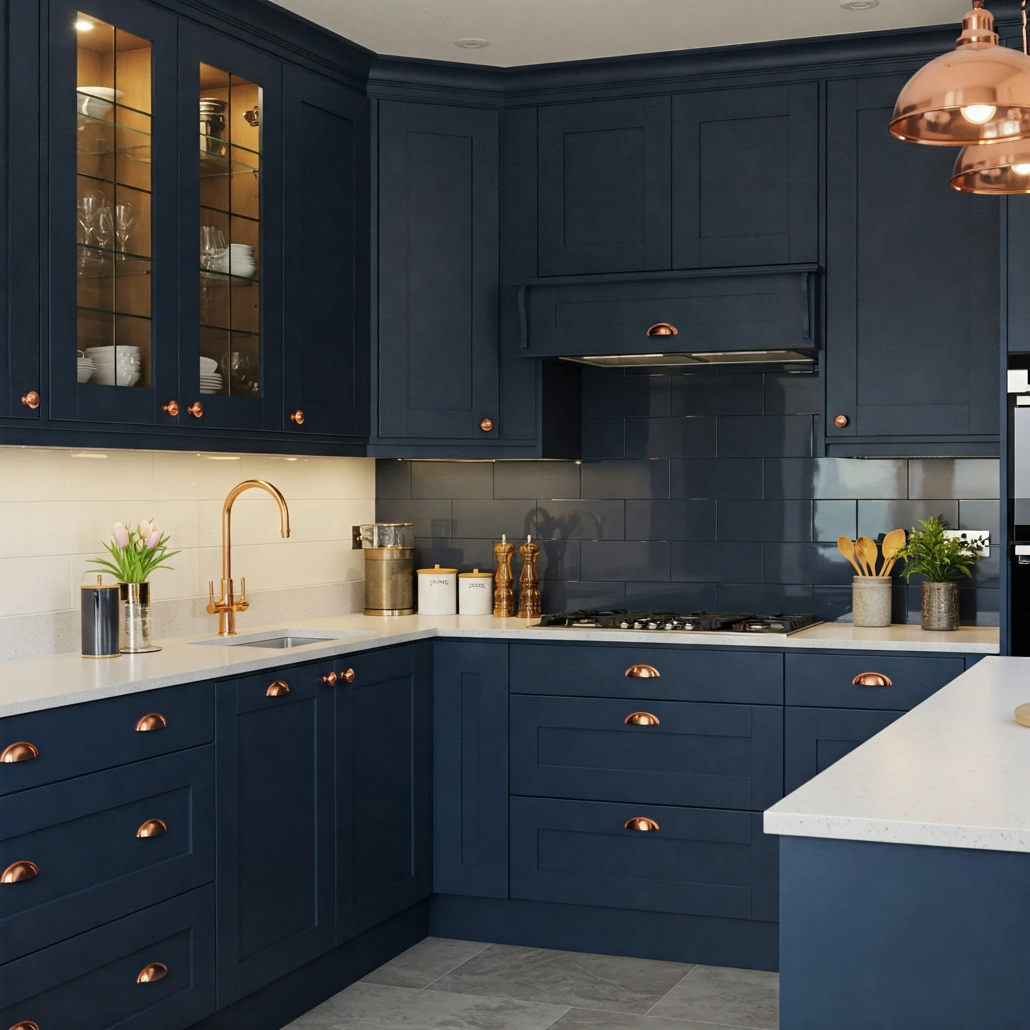 Navy blue may be classic, but when you add metallic accents, it steps into the realm of modern luxury. Think of shimmering gold or brass hardware that contrasts elegantly against a dark cabinet door. It’s a bit like wearing a fine gold watch with a deep-blue suit—sophisticated, eye-catching, and undeniably posh. If gold feels too bold, consider subtler metals like brushed nickel or matte black for a sleek, understated effect. Light fixtures, pendant lamps, or even small décor items on the counter can echo these metallic tones, tying the whole look together. The interplay between cool navy and warm metal exudes a high-end vibe, as though you’ve stepped into a designer showcase. This approach works especially well in kitchens with an open layout, allowing each gleaming metal piece to shine like little constellations in your culinary universe.