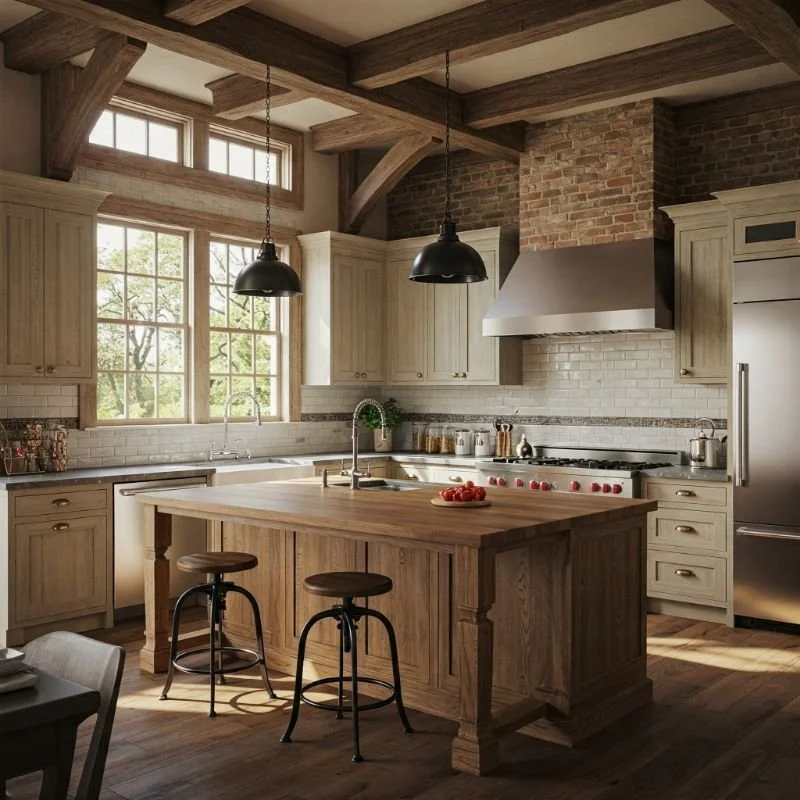 A modern rustic kitchen often includes open shelving, a reclaimed wood island, stainless steel appliances, and earthy color palettes. These elements combine to create a space that is both highly functional and warm, inviting, and full of character.