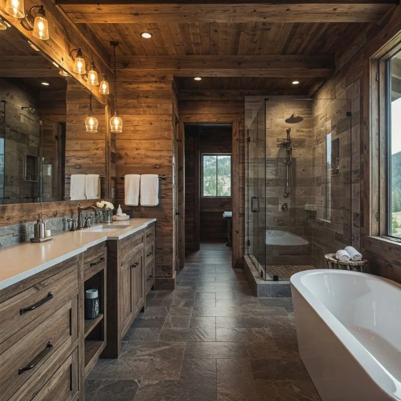 A modern rustic bathroom marries functionality with warm, inviting style to create a personal spa-like retreat. Imagine a bathroom that features natural stone surfaces, reclaimed wood vanities, and sleek modern fixtures that harmonize beautifully with vintage accents. This blend of materials creates an atmosphere of both sophistication and comfort, where every detail—from the mosaic tile patterns to the ambient lighting—contributes to a serene environment. Functional storage solutions, such as recessed shelving and minimalist cabinetry, ensure that your space remains clutter-free while showcasing the rustic elements that add character and warmth. It’s like stepping into a private haven where every moment is dedicated to self-care, combining modern convenience with the timeless charm of nature. A well-designed rustic bathroom becomes a personal retreat that enhances your daily routine with style and tranquility.