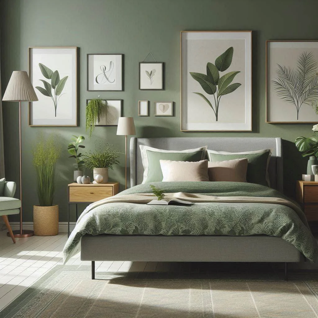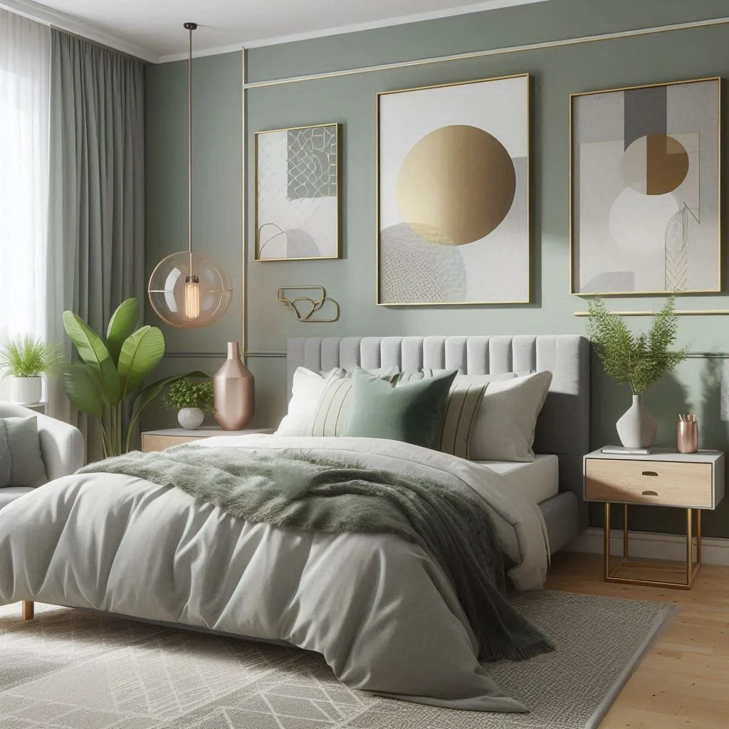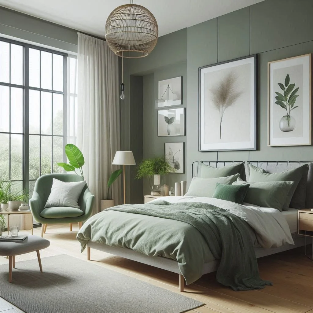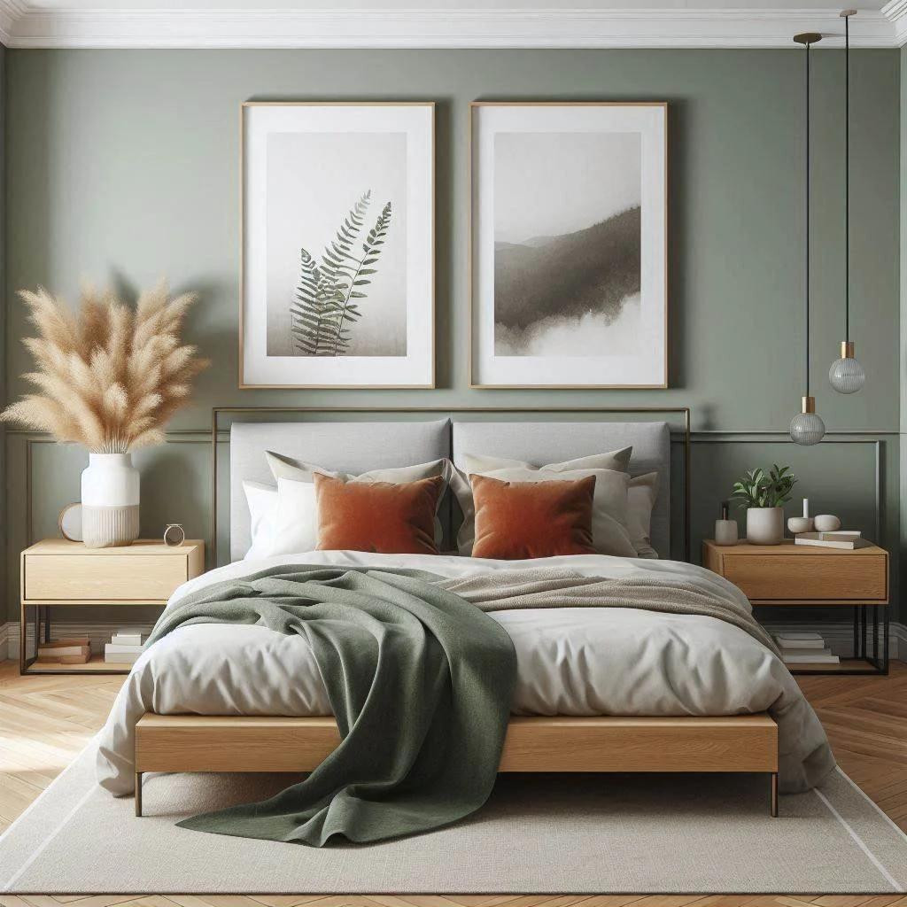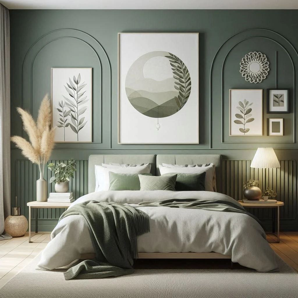 Incorporating sage green into your bedroom through wall art is an elegant way to introduce this soothing color. Whether you choose a large abstract painting, a series of botanical prints, or a piece of textured art, sage green wall decor can serve as a focal point that ties the room together. This approach allows you to add a pop of color in a controlled and versatile way, complementing the overall design without overwhelming the space. Sage green artwork brings a sense of harmony and tranquility, enhancing the room’s ambiance. Additionally, wall art is easy to change or update, giving you the flexibility to adapt your decor as your style evolves while maintaining a cohesive and stylish look.