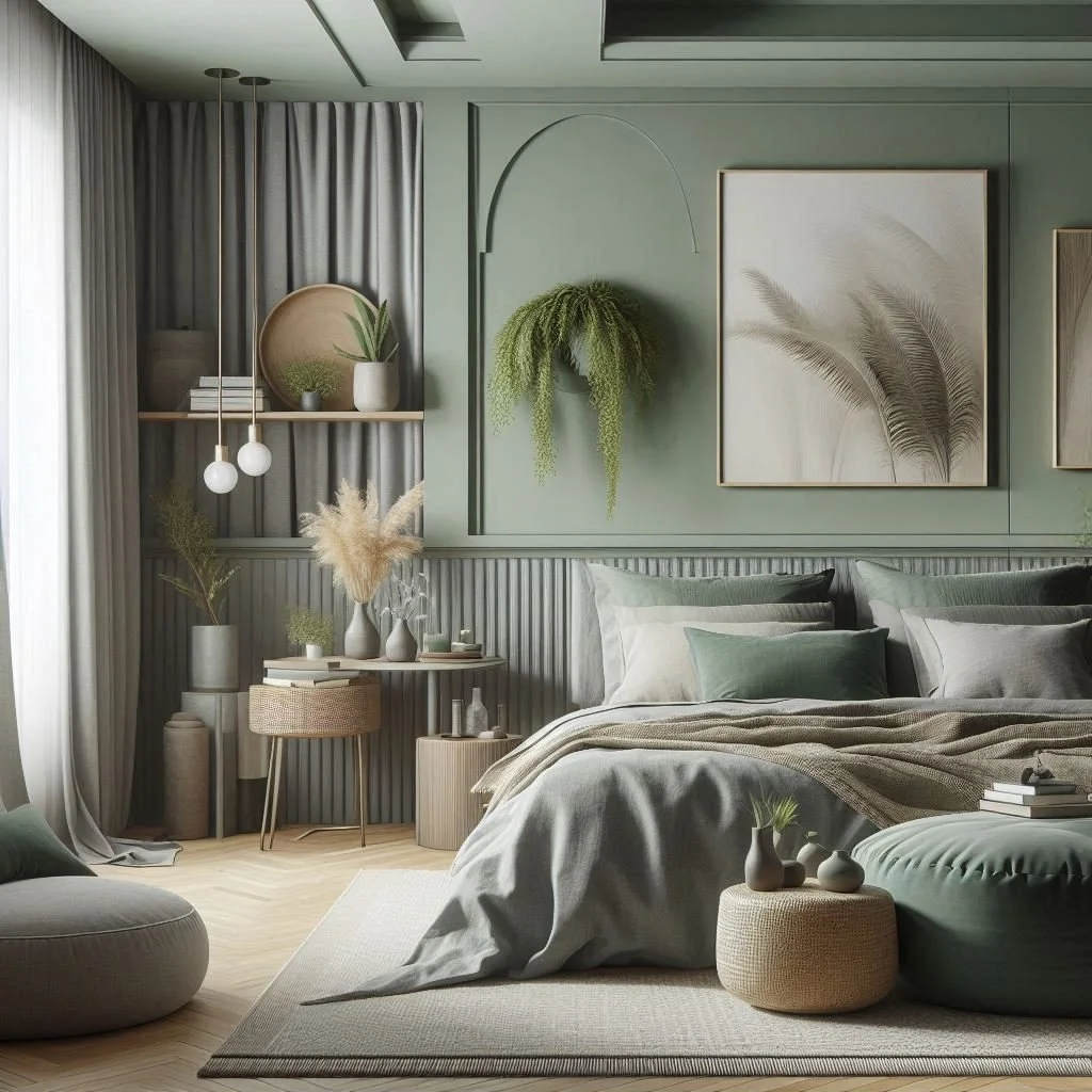 Natural materials like wood, linen, and rattan pair well with sage green. These materials enhance the organic, calming feel of the color, creating a harmonious and relaxing space.