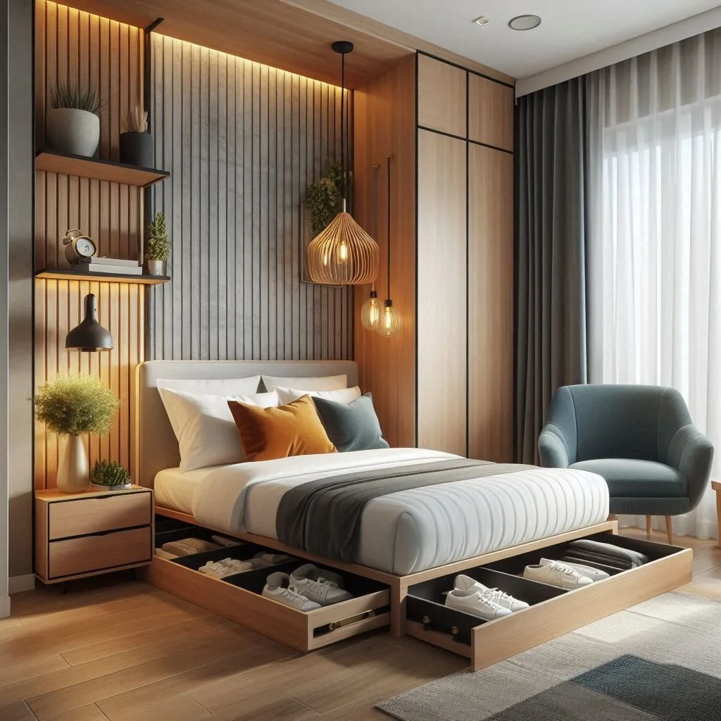 Opt for sleek, low-profile furniture that offers storage solutions, like beds with built-in drawers.