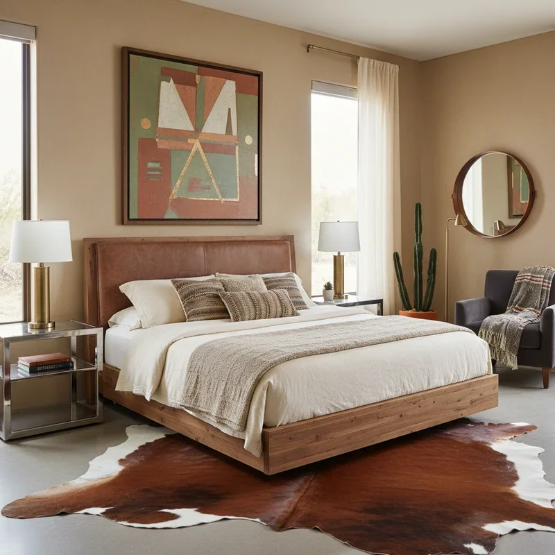 Forget everything you thought you knew about cowhide rugs being purely rustic! These natural beauties become high-fashion statements when styled correctly in modern bedrooms. Layer a cowhide over a larger neutral rug for sophisticated depth, or let it stand alone as a bold focal point beside your bed. Choose unexpected colors like metallic-dipped edges or dyed versions in deep jewel tones for contemporary appeal. The organic shape breaks up angular modern furniture while adding warmth that synthetic materials can't match. Position your cowhide at an angle rather than perfectly parallel to walls, creating dynamic movement in otherwise static spaces. Quality matters here: invest in ethically sourced, properly treated hides that won't shed or smell. The natural variation in patterns means your rug is genuinely one-of-a-kind, adding that bespoke element modern western style celebrates.