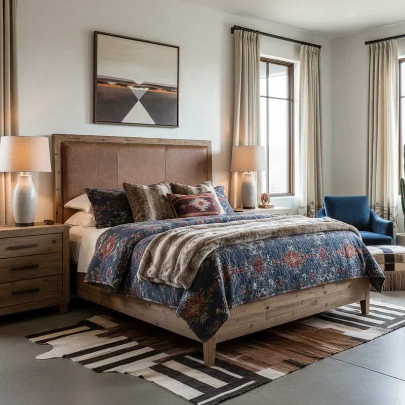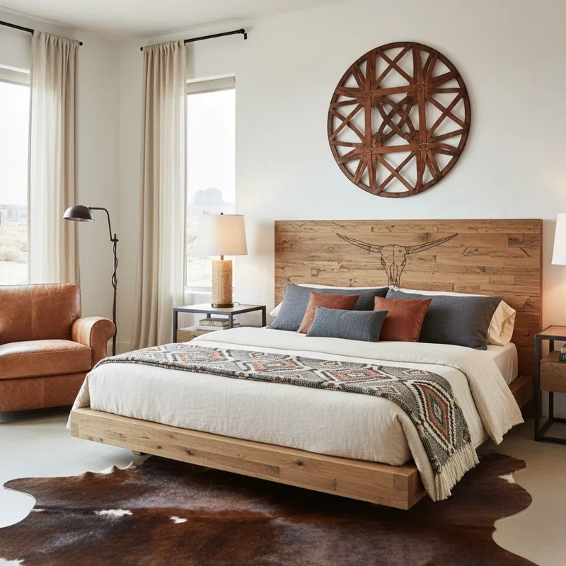 Honor indigenous artistry while keeping your bedroom firmly planted in the present by choosing modern interpretations of traditional patterns! Look for geometric designs inspired by Native American textiles but executed in contemporary colorways like black and white or muted desert tones. Use these patterns sparingly: a single statement blanket, accent pillows, or upholstered bench prevents cultural appropriation while adding meaningful design elements. Choose authentic pieces from indigenous artists when possible, supporting communities while ensuring quality and authenticity. Modern manufacturing techniques allow for performance fabrics that maintain traditional aesthetics while offering easy care and durability. These patterns add movement and interest to otherwise minimal spaces, creating focal points that spark conversation. The key is restraint: one or two patterned elements make a statement, while too many create chaos that contradicts modern western's clean aesthetic.