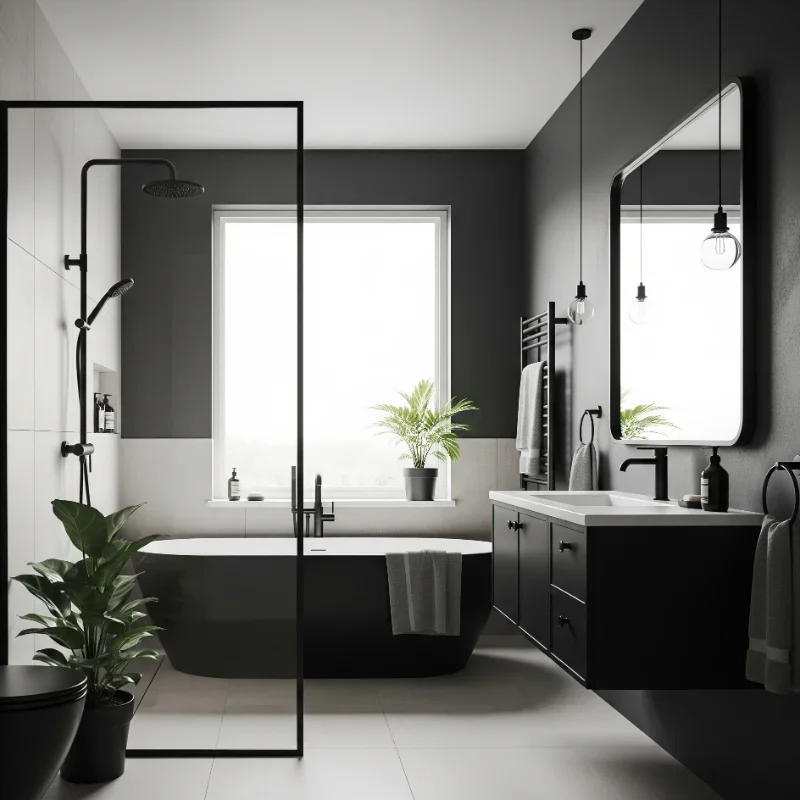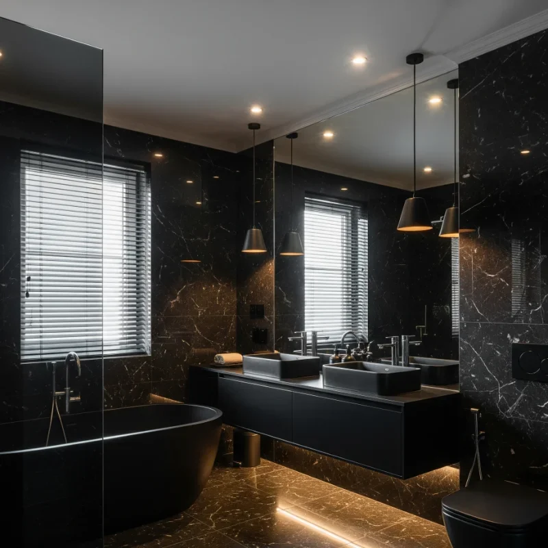 Transform your bathroom into a luxurious cave of sophistication with an all-black design that commands attention! This bold approach works best with multiple black textures: matte walls, glossy tiles, and black marble with white veining. The key to avoiding a black hole effect lies in layered lighting and reflective surfaces. Mix black fixtures, black vanity, and black flooring for complete immersion. Add mirrors strategically to bounce light and create depth. Metallic accents in gold, brass, or chrome provide necessary sparkle against the darkness. Plants pop dramatically against black backgrounds, adding life to the monochrome palette. Quality materials matter more in all-black rooms since every imperfection shows. Your bathroom becomes a cocoon of luxury that makes every visit feel like a spa experience in a chic urban hotel!