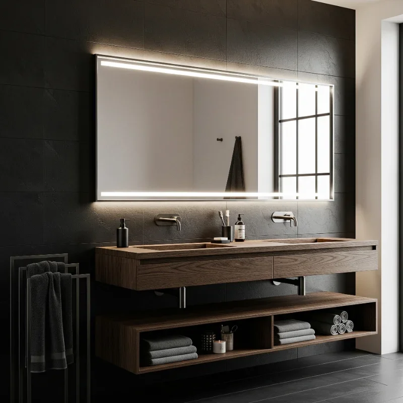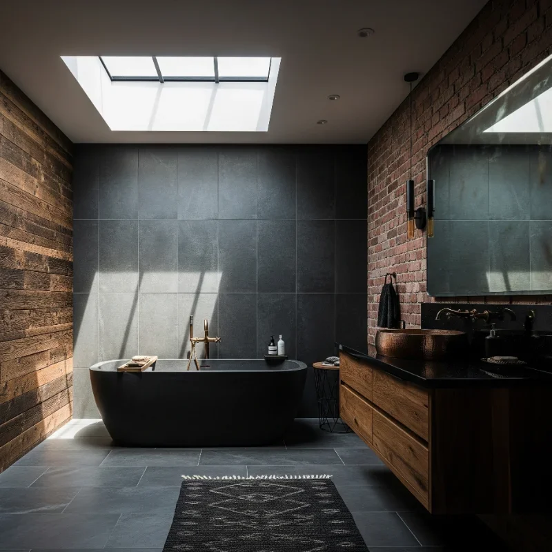 Blend organic warmth with industrial cool by combining dark wood with metal elements! Ebony, walnut, or stained oak vanities ground the space with natural beauty. Pair with black iron, aged brass, or copper fixtures for rich contrast. Exposed pipes in dark metals enhance industrial vibes. Wood shelving with metal brackets provides functional style. The combination prevents either material from overwhelming. Dark wood floors with metal threshold strips create seamless transitions. This pairing works in both rustic and modern contexts. Add leather elements for extra texture. The mix of hard and soft, natural and manufactured creates dynamic interest. Your bathroom achieves that perfect balance of warmth and edge!