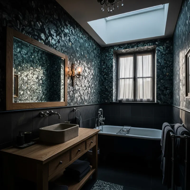 Transform your bathroom with dramatic wallpaper that adds pattern and depth to dark designs! Dark florals, geometric patterns, or textured designs in deep colors create instant atmosphere. Moisture-resistant wallpapers designed for bathrooms ensure longevity. Choose patterns with metallic accents for light play. Large-scale patterns make bold statements while small repeats add subtle texture. Dark damask or toile patterns bring traditional elegance with moody twist. Consider one accent wall to avoid overwhelming small spaces. Black and gold combinations feel especially luxurious. Textured grasscloth in dark shades adds organic interest. Your bathroom gains personality and artistic flair that paint alone can't achieve. It's like wrapping your walls in designer fabric!