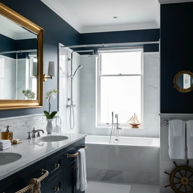 Dive into sophistication with deep navy blues that bring oceanic depth to your bathroom sanctuary! Navy offers darkness with more approachability than black, creating moody elegance without overwhelming. Paint walls in rich navy and pair with white fixtures for classic nautical contrast. Brass or gold hardware warms the cool blue beautifully. Navy subway tiles create texture while maintaining the color story. This shade works particularly well with marble, whether white with blue veining or dramatic navy marble itself. Add navy textiles through plush towels and bath mats. The color photographs beautifully in different lights, shifting from near-black to revealing blue undertones. Your bathroom achieves that yacht club elegance that feels both exclusive and welcoming!