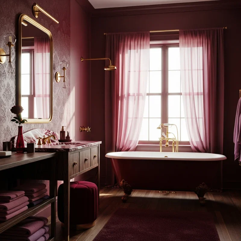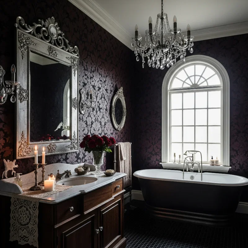 Transform your bathroom into a Victorian gothic sanctuary where elegance meets mysterious allure! Picture elaborate mirrors framed in deep black, vintage clawfoot tubs refinished in rich charcoal tones, and dramatic candelabra-style lighting casting dancing shadows. Adorn walls with luxurious damask wallpaper in midnight purples or obsidian blacks to establish authentic period ambiance. Curate vintage treasures like antique crystal perfume bottles, ornate silver accessories, and arrangements of dried roses or lavender. The secret lies in harmoniously blending decorative opulence with contemporary practicality. Sumptuous velvet drapes or tailored roman shades introduce textural richness. Combine brass, copper, and pewter finishes for genuine Victorian character. This bold aesthetic celebrates theatrical grandeur unapologetically. Cleverly integrate modern amenities behind period-appropriate facades. Your bathroom transforms into an enchanting gothic romance where everyday rituals become poetic ceremonies!