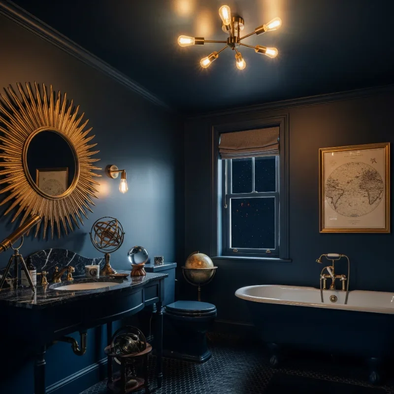 Create a bathroom that feels like floating in the night sky with midnight blue as your cosmic canvas! This almost-black blue brings mystery without harshness. Walls in midnight blue make metallic fixtures shine like stars. Add constellation-inspired lighting or star-pattern tiles for literal interpretation. The color transitions beautifully from day to night, appearing differently under various lighting. Pair with white marble for classic elegance or go full drama with black accents. Silver and chrome fixtures enhance the cool celestial feeling. This shade particularly suits bathrooms with good natural light that reveals blue undertones. Your bathroom becomes a nightly journey to the stars, making bedtime routines feel magical!