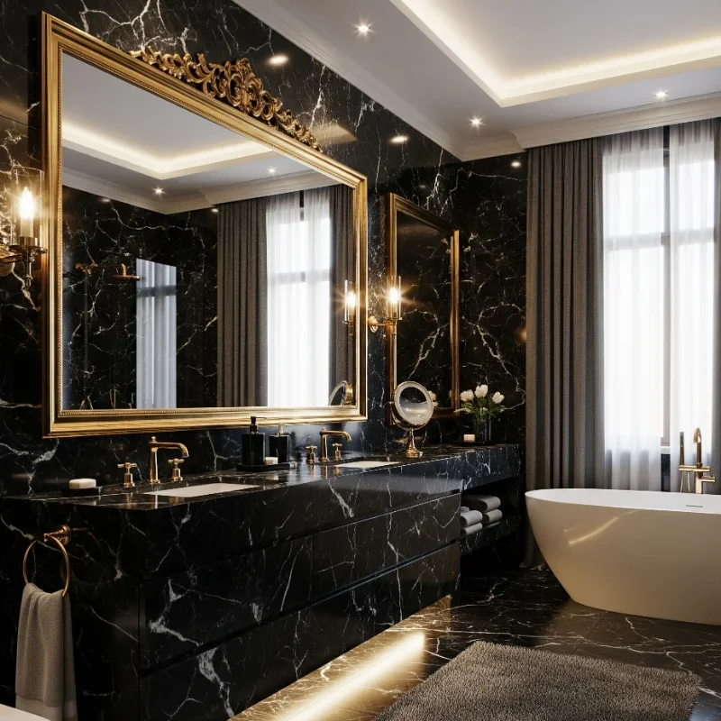Make a lasting impression with dark marble that transforms walls into natural artwork! Black marble with dramatic white veining creates instant luxury. Nero Marquina, Dark Emperador, or Black Forest marble each offer unique patterns. Book-matching creates symmetrical designs that mesmerize. Use large slabs to minimize grout lines and maximize impact. Dark marble works beautifully as accent walls behind vanities or in showers. The natural variations ensure uniqueness while maintaining sophistication. Proper sealing protects your investment in high-moisture environments. Combine with simple fixtures that don't compete with marble's natural drama. Your bathroom gains gallery-worthy walls that make daily routines feel like five-star experiences!