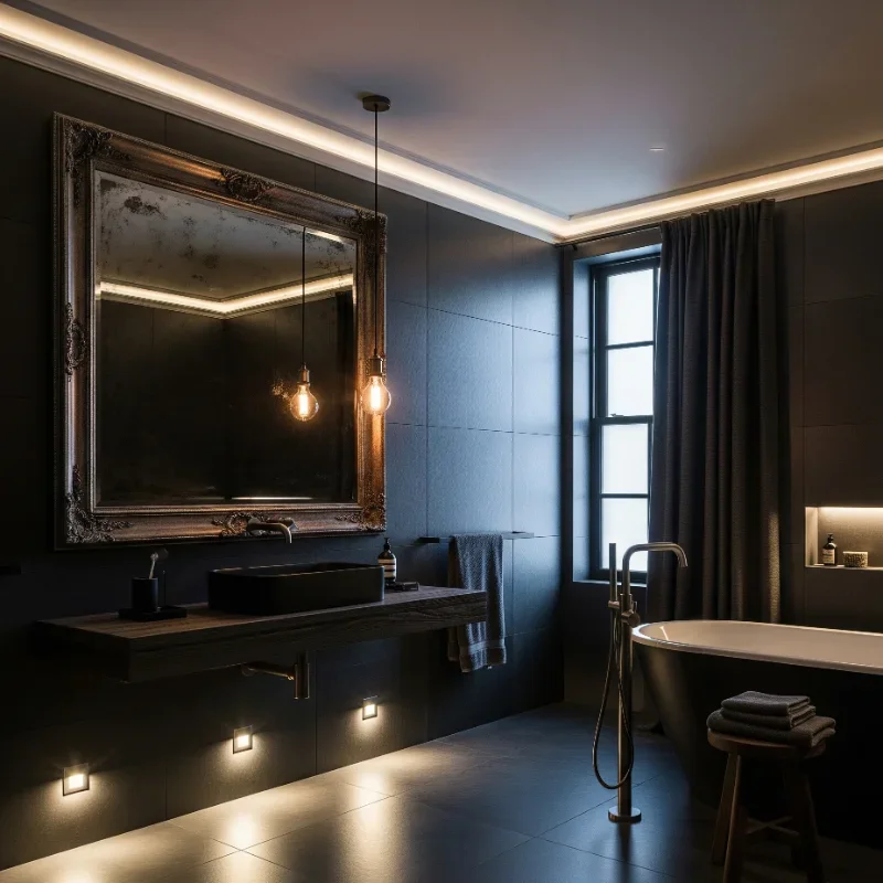 Master the art of illumination in moody bathrooms where lighting becomes the star player! Layer multiple light sources: ambient, task, and accent lighting work together. Dimmers are essential for mood control. Wall sconces flanking mirrors provide flattering light for grooming. Chandelier or pendant lights add glamour and become focal points. LED strips under vanities create floating effects. Backlit mirrors provide soft glow without harshness. Consider colored bulbs for extra moodiness: warm amber or cool blue. Candlelight adds romance and complements electric lighting. The goal is avoiding harsh shadows while maintaining mysterious ambiance. Your lighting scheme becomes the difference between cave-like and cocoon-like!