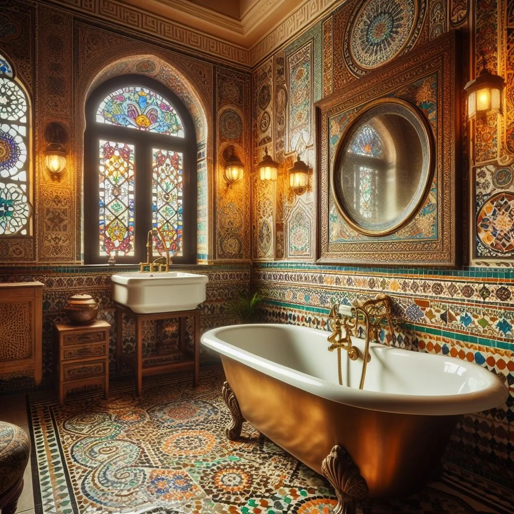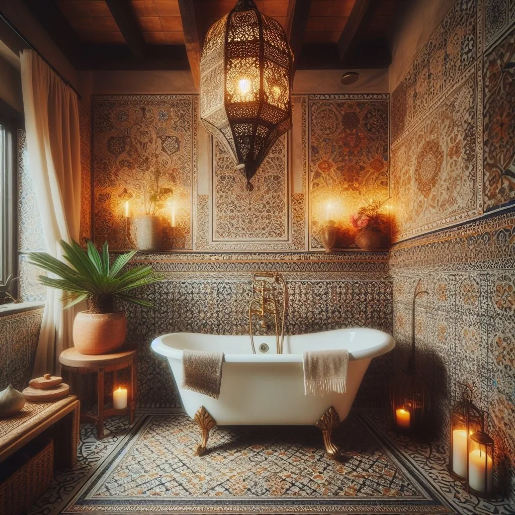 Add a touch of Moroccan charm to your bathroom with intricately patterned tiles that evoke the beauty and craftsmanship of traditional Moroccan design. Explore a variety of tile shapes, sizes, and colors, including zellige, encaustic, and mosaic tiles, that can be used to create stunning floors, walls, and accents in your bathroom space. Consider mixing and matching different tile patterns to create a visually dynamic and harmonious design that reflects the rich cultural heritage of Morocco. Whether adorning your shower walls, accentuating your vanity backsplash, or framing your mirror, majestic Moroccan tiles are sure to add a touch of exotic elegance and timeless beauty to your bathroom sanctuary.