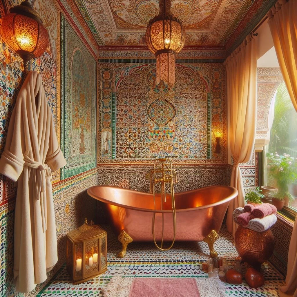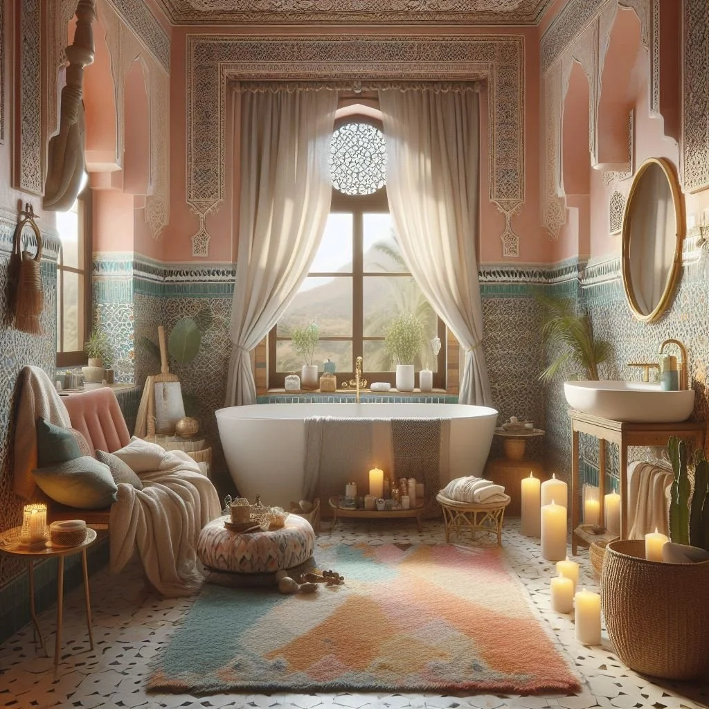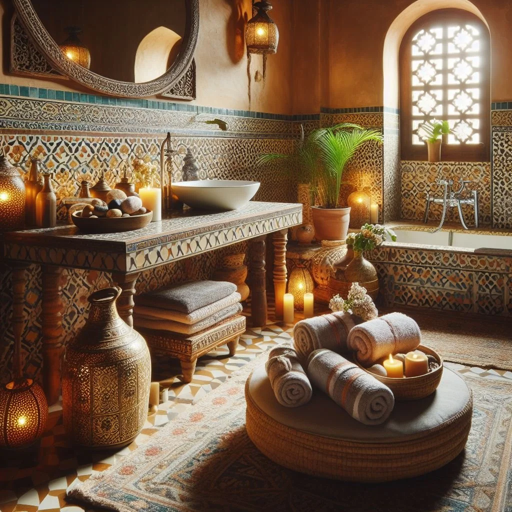 Create a spa-like experience in your bathroom with Moroccan-inspired amenities such as scented candles, aromatic oils, and fragrant soaps that transport you to a world of relaxation and rejuvenation. Explore a variety of spa products infused with Moroccan ingredients such as argan oil, rose water, and orange blossom that nourish the skin and soothe the senses. Consider setting the mood with soft lighting, soothing music, and aromatic diffusers that create a tranquil ambiance and promote a sense of well-being. Whether indulging in a luxurious bath, enjoying a revitalizing shower, or pampering yourself with a hydrating facial mask, Moroccan-inspired spa amenities elevate your bathing experience to new heights of luxury and indulgence, allowing you to escape from the stresses of daily life and immerse yourself in a world of serenity and tranquility.