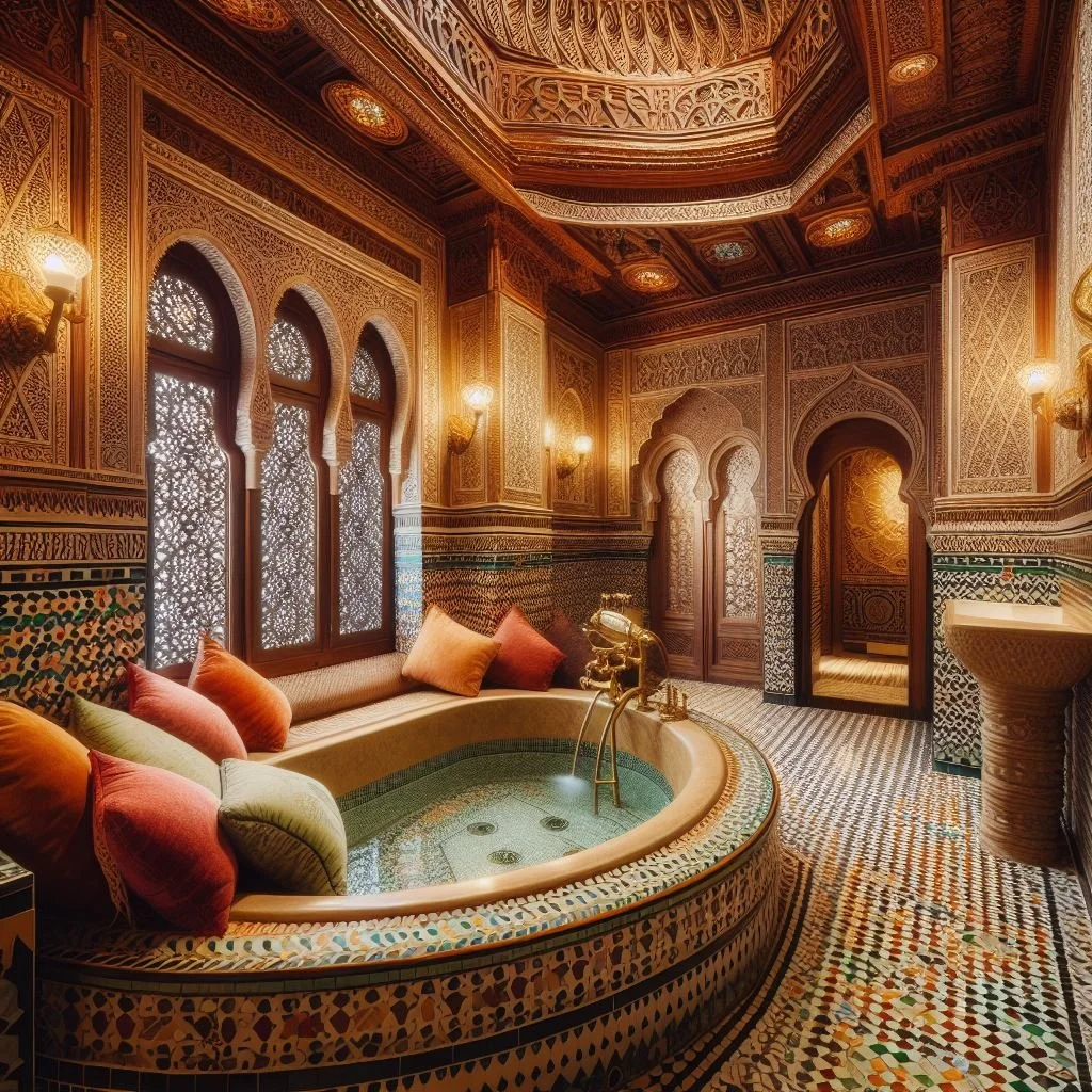 Indulge in relaxation with a luxurious Moroccan tub, featuring elegant curves and intricate detailing that exude opulence and sophistication. Explore a variety of tub styles, including freestanding clawfoot tubs, alcove tubs, and sunken tubs, that offer both comfort and style in your bathroom space. Consider embellishing your tub with decorative tile surrounds, ornate metalwork, or sculptural fixtures that elevate its aesthetic appeal and create a focal point in your bathing sanctuary. Whether soaking in a warm bath infused with essential oils or enjoying a leisurely soak under the stars, luxurious Moroccan tubs provide the perfect escape from the stresses of daily life, allowing you to indulge in a moment of tranquility and self-care in your own home.