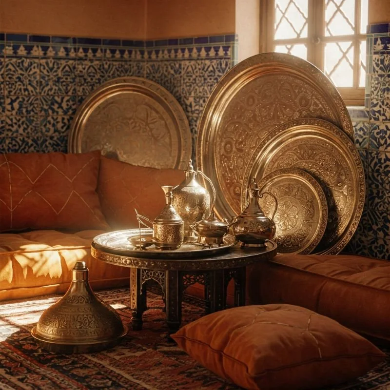Gleaming metal trays are a staple in Moroccan décor, serving both functional and ornamental purposes. Crafted from materials like silver or brass, these trays often boast ornate designs etched into their surfaces, reflecting the region’s dedication to exquisite detail. You might position one on a coffee table as a focal centerpiece, layering it with candles, small vases, or even a decorative tajine. They also work wonders as serving pieces during gatherings—imagine offering sweet pastries and tea on a tray that glints under ambient lighting. If you want to highlight the tray’s artful beauty, consider propping it up against a wall on a shelf. The interplay of metallic shine against rich, earthy color palettes echoes the harmonious contrast that Moroccan interiors are famous for, blending luxe sophistication with everyday practicality.