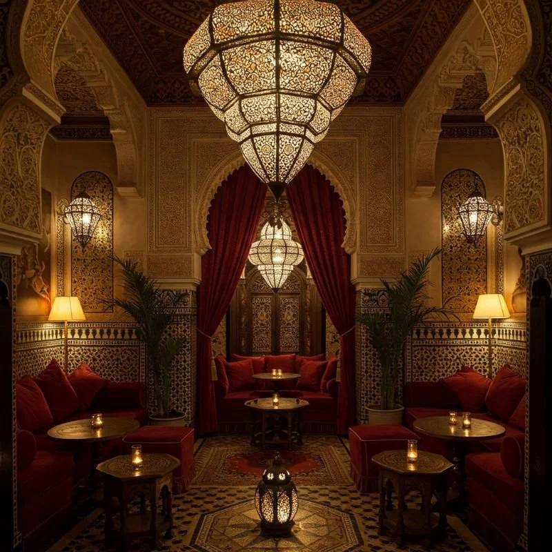 In Moroccan interiors, lighting isn’t just functional; it’s an opportunity to enhance the enchanting atmosphere. Beyond classic metal lanterns, you might consider a grand chandelier dripping with colored glass or a contemporary pendant with cut-out patterns. When lit, these fixtures cast intricate shadows that waltz across your walls, turning a simple night at home into a whimsical experience. Feel free to layer different types of lighting—think wall sconces, floor lamps, and table lamps—to create pockets of illumination that highlight specific décor elements. For instance, a spotlight on an ornate mirror or a subtle glow around a plush seating area can dramatically shift your space from ordinary to mystical. This layering approach ensures that you’re not just decorating with lights; you’re crafting a luminous landscape that captures the spirit of Morocco’s bustling souks and serene courtyards.