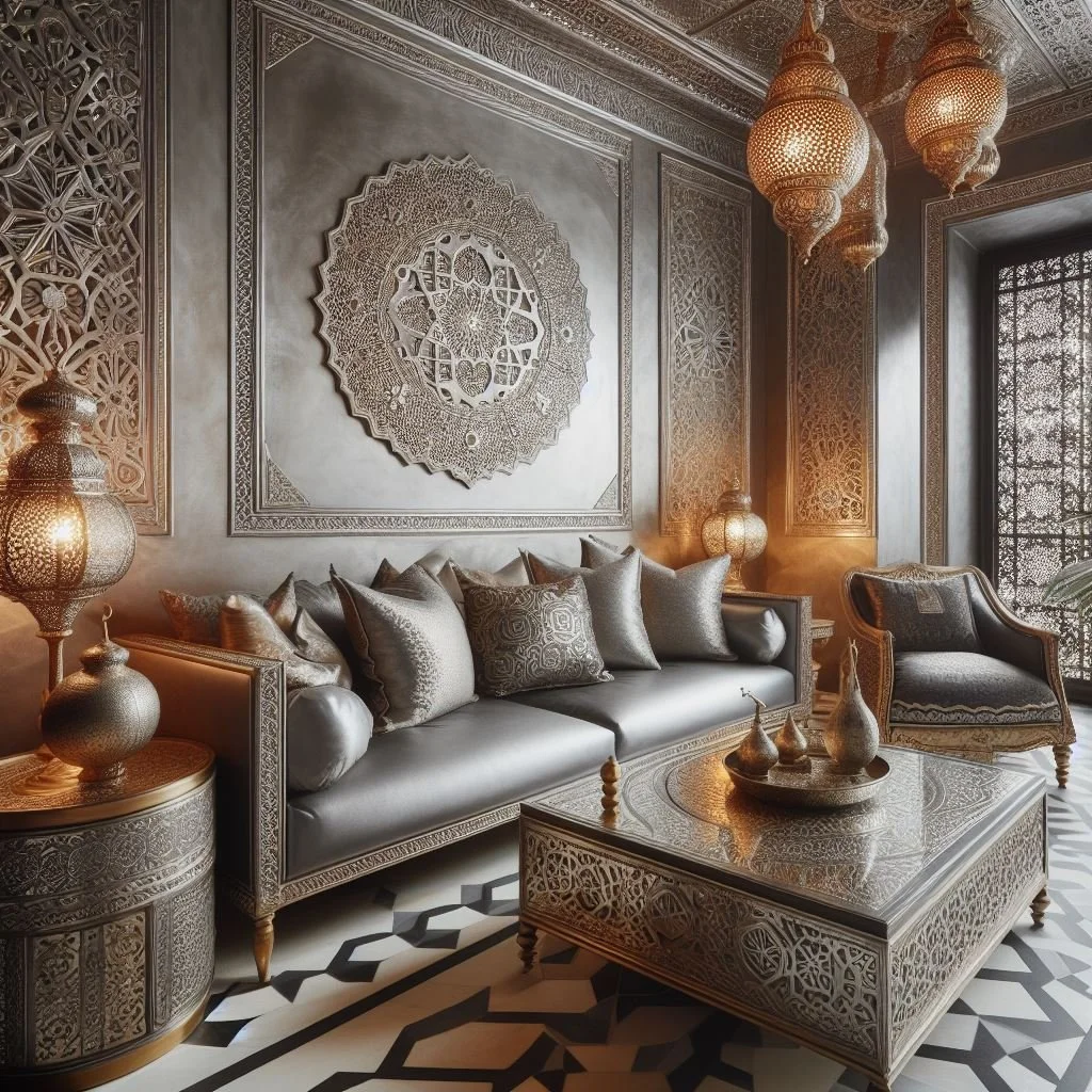 Incorporate metallic accents such as brass, copper, and silver into your decor to add a touch of glamour and sophistication. Embrace the intricate metalwork adorning lanterns, trays, and decorative hardware, infusing your decor with a sense of lavishness and refinement. These shimmering elements serve as focal points, casting captivating plays of light and shadow, while also adding depth and dimension to your surroundings. Whether subtly incorporated through accent pieces or boldly showcased as statement fixtures, metallic accents exude a timeless elegance that effortlessly enhances the overall ambiance of your home, evoking the exotic charm and allure of Moroccan aesthetics.